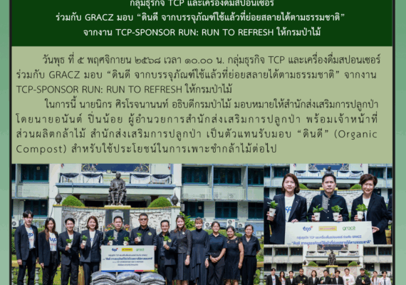วันพุธ ที่ ๕ พฤศจิกายน ๒๕๖๘ เวลา ๑๐.๐๐ น. กลุ่ม […] กลุ่มธุรกิจ TCP และเครื่องดื่มสปอนเซอร์ ร่วมกับ GRACZ มอบ “ดินดี จากบรรจุภัณฑ์ใช้แล้วที่ย่อยสลายได้ตามธรรมชาติ” จากงาน TCP-SPONSOR ...10 พฤศจิกายน 2025 by nursery