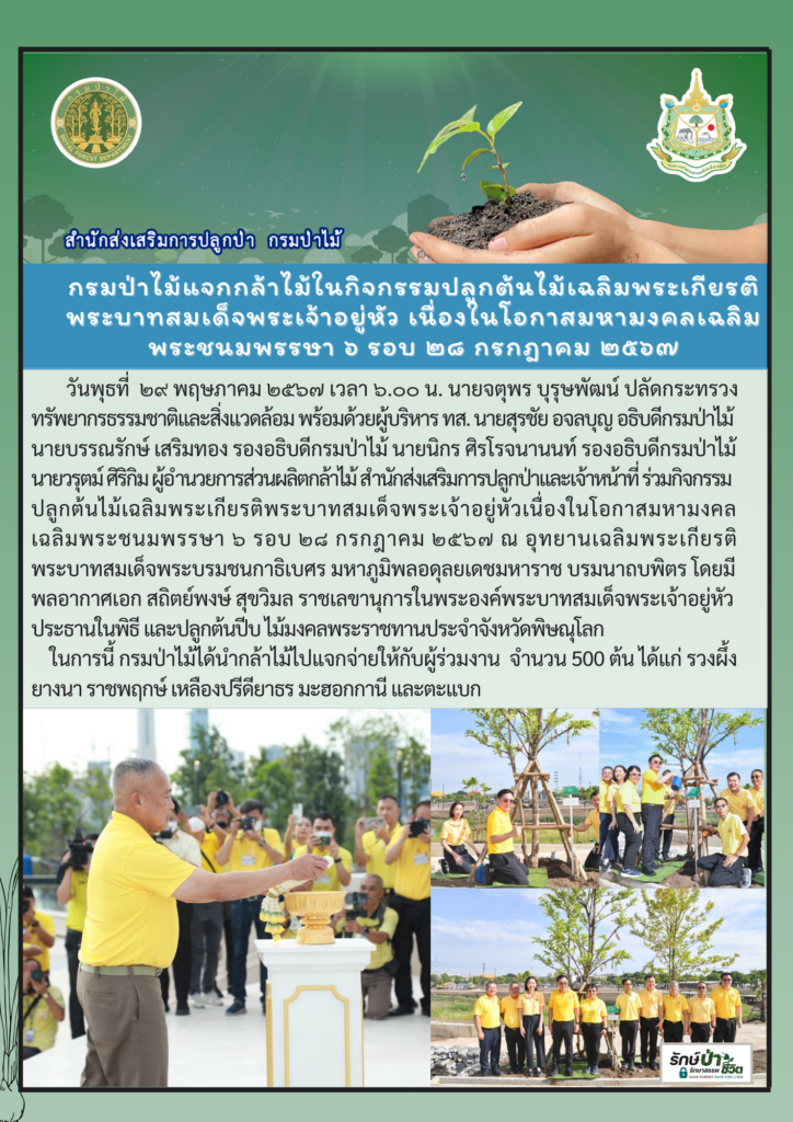 กรมป่าไม้ร่วมแจกกล้าไม้กิจกรรมปลูกต้นไม้เฉลิมพระเกียรติพระบาทสมเด็จพระเจ้าอยู่หัว เนื่องในโอกาสมหามงคลเฉลิมพระชนมพรรษา ๖ รอบ ๒๘ กรกฎาคม ๒๕๖๗30 พฤษภาคม 2024 by nursery