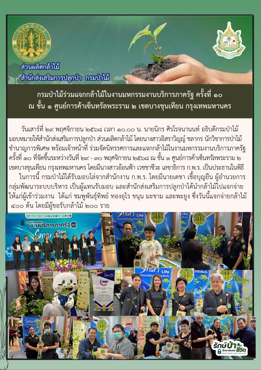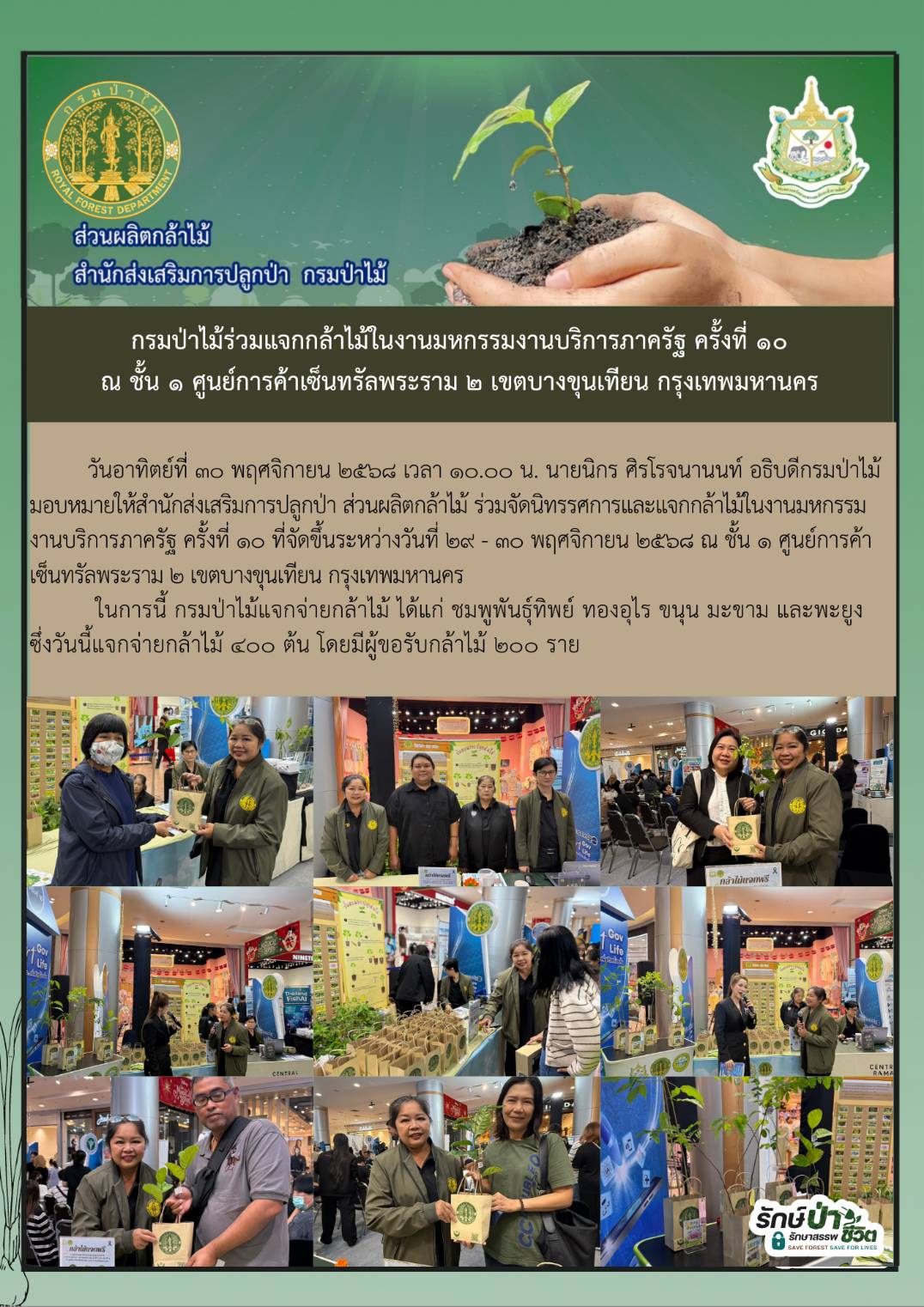 กรมป่าไม้ร่วมแจกกล้าไม้ในงานมหกรรมงานบริการภาครัฐ ครั้งที่ ๑๐ ระหว่างวันที่ ๒๙-๓๐ พ.ย. ๒๕๖๘ ณ ศูนย์การค้าเซ็นทรัลพระราม ๒ เขตบางขุนเทียน กรุงเทพฯ