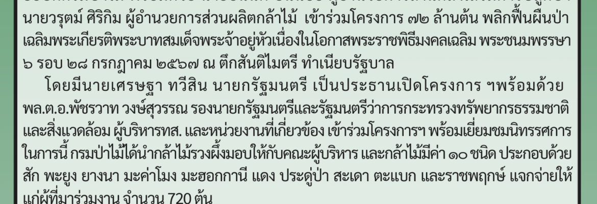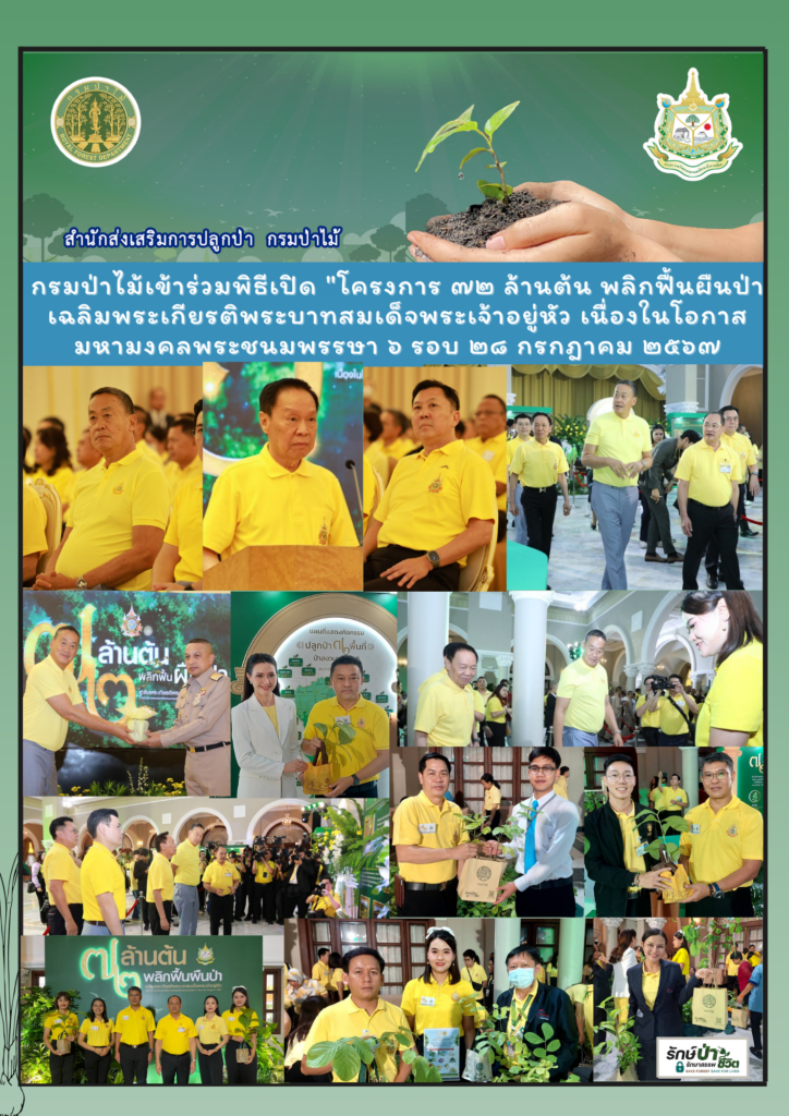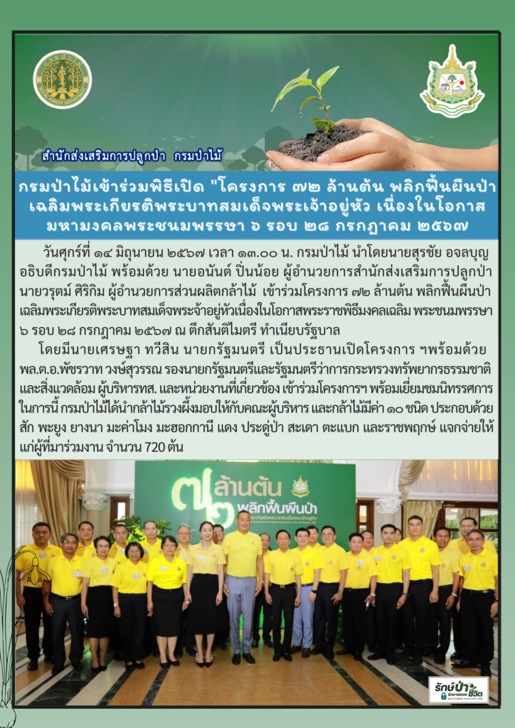 กรมป่าไม้เข้าร่วมพิธีเปิด “โครงการ ๗๒ ล้านต้น พลิกฟื้นผืนป่า เฉลิมพระเกียรติพระบาทสมเด็จพระเจ้าอยู่หัว เนื่องในโอกาสมหามงคลเฉลิมพระชนมพรรษา ๖ รอบ ๒๘ กรกฎาคม ๒๕๖๗” ณ ทำเนียบรัฐบาล14 มิถุนายน 2024 by nursery