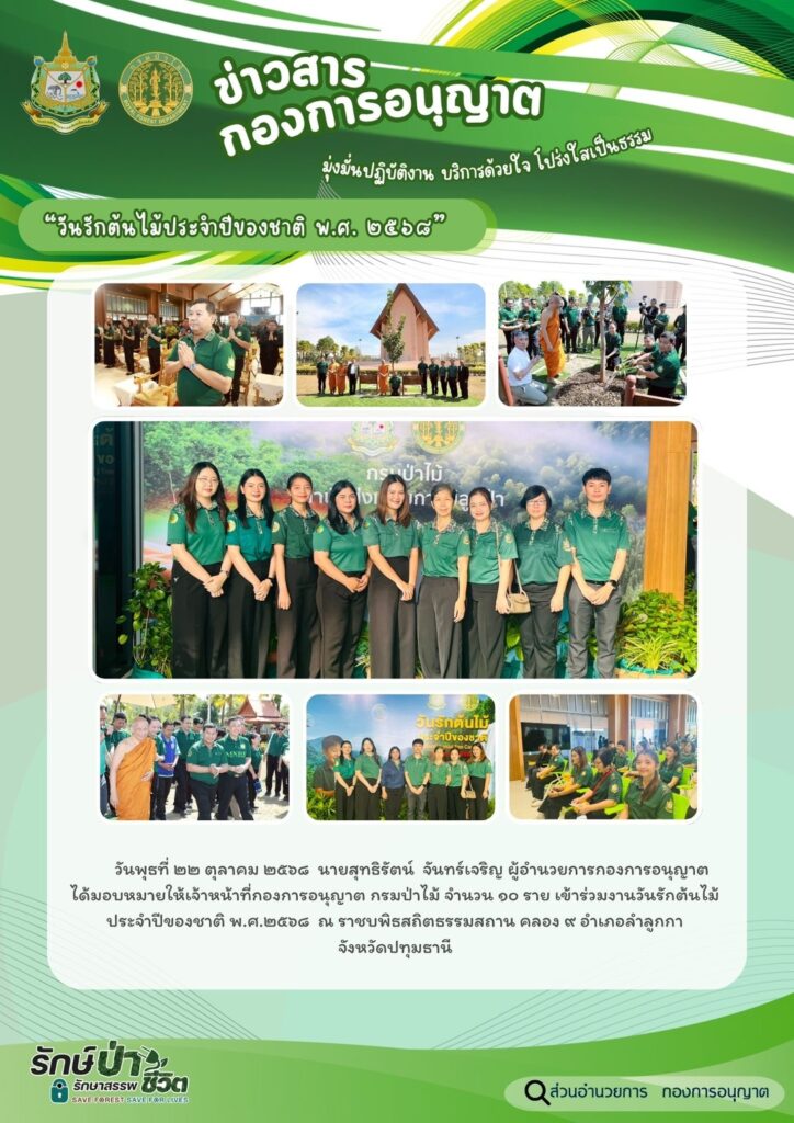 เมื่อวันที่ 22 ตุลาคม 2568 นายสุทธิรัตน์ จันทร์เจริญ ผู้อำนวยการกองการอนุญาต พร้อมกับเจ้าหน้าที่กองการอนุญาต เข้าร่วมงานวันรักต้นไม้ประจำปีของชาติ พ.ศ. 2568 ณ ราชบพิธสถิตธรรมสถาน คลอง 9 ลำลูกลา จังหวัดปทุมธานี เพิ่งได้รับการแก้ไข !รายการนี้ถูกเผยแพร่ใน ข่าวสารและกิจกรรม on 18 พฤศจิกายน 2025 by permission