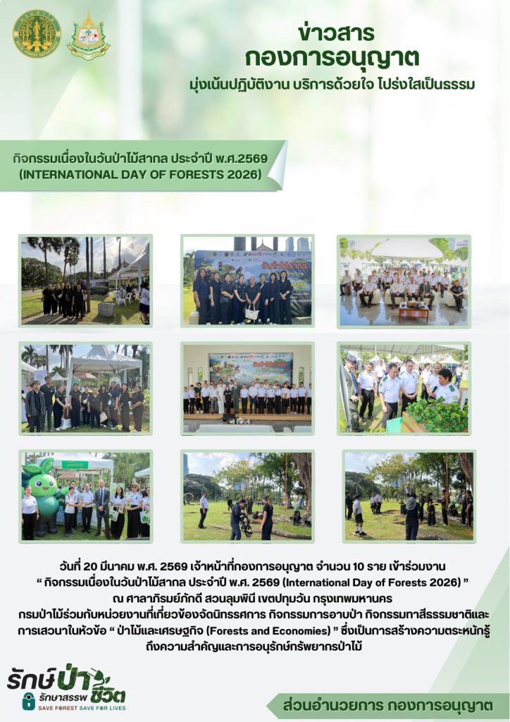 เมื่อวันที่ 20 มีนาคม 2569 นายสุทธิรัตน์ จันทร์เจริญ ผู้อำนวยการกองการอนุญาต ได้มอบหมายเจ้าหน้าที่กองการอนุญาต เข้าร่วมงานวันป่าไม้สากล ประจำปีงบประมาณ พ.ศ. 2569 (International Day of Forests 2026) ณ ศาลาภิรมย์ภักดี สวนลุมพินี เขตปทุมวัน กรุงเทพมหานคร เพิ่งได้รับการแก้ไข !