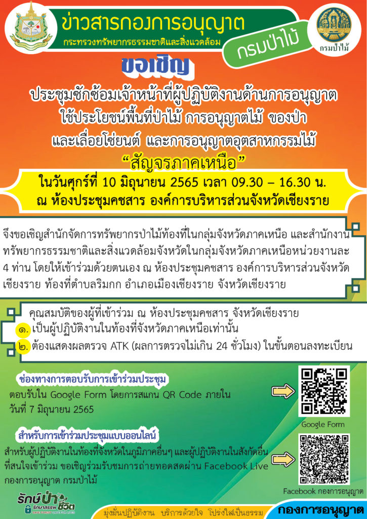 กองการอนุญาต ขอเชิญชวนผู้ที่สนใจเข้าร่วมการประชุมซักซ้อมเจ้าหน้าที่ผู้ปฏิบัติงานด้านการอนุญาตฯ ผ่านทาง Facebook Liveรายการนี้ถูกเผยแพร่ใน ข่าวสารและกิจกรรม Facebook Live : กองการอนุญาต กรมป่าไม้