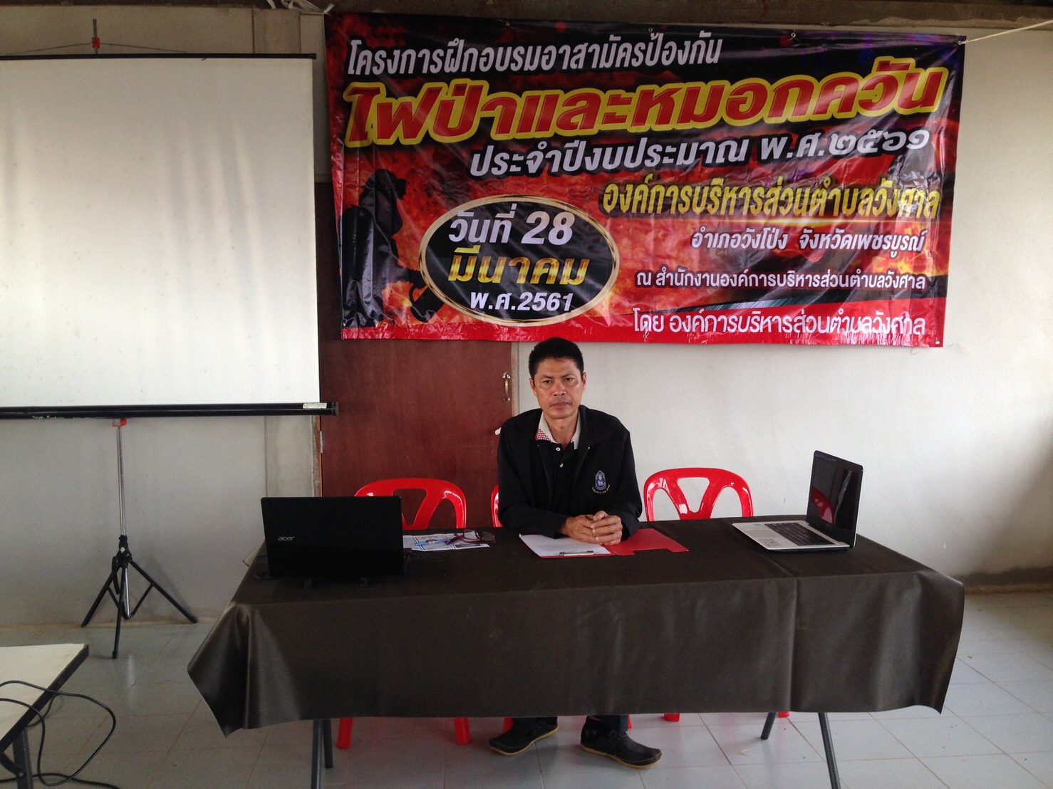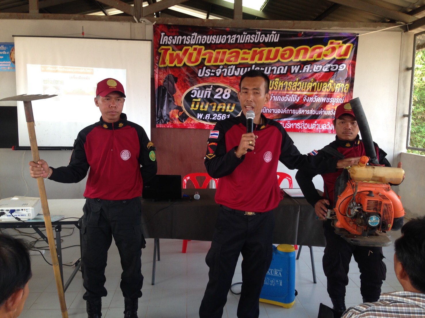 กิจกรรมที่ ๑ เวลา ๐๘.๐๐ น. ส่งเจ้าหน้าที่ร่วมกับเจ้าหน้าที่หน่วยป้องกันรักษาป่าที่ พช.๔ ( เนินมะค่า ) สจป.ที่ ๔ สาขาพิษณุโลก จัดนิทรรศการ, แจกจ่ายเอกสารแผ่นพับเกี่ยวกับความรู้ เรื่อง ไฟป่าเบื้องต้น จำนวน ๖๐ ชุด พร้อมเป็นวิทยากรบรรยายความรู้เรื่อง ไฟป่า ทั้งภาคทฤษฎีและภาคปฏิบัติ การใช้อุปกรณ์ดับไฟ วิธีและเทคนิคการควบคุมไฟป่า กฎหมายที่เกี่ยวข้องกับการควบคุมไฟป่า การลดปริมาณเชื้อเพลิงโดยการใช้กล่องลดปริมาณเชื้อเพลิง และการทำแนวกันไฟ พร้อมมอบประกาศกรมป่าไม้ เรื่อง กำหนดมาตรการขอความร่วมมือในการป้องกันและ ควบคุมไฟป่า และประกาศจังหวัดเพชรบูรณ์ เรื่อง กำหนดเขตควบคุมไฟป่าท้องที่จังหวัดเพชรบูรณ์ ให้แก่ อปท.และผู้นำชุมชน เพื่อนำไปประชาสัมพันธ์ ปิดประกาศให้ประชาชนในพื้นที่ได้ทราบโดยทั่วถึงกันต่อไป ตามโครงการฝึกอบรมอาสาสมัครป้องกันไฟป่าและหมอกควันประจำปีงบประมาณ ๒๕๖๑ จัดโดยองค์การบริหารส่วนตำบลวังศาล ณ ศาลาอเนกประสงค์บ้านวังชุมนุม ม.๒ ต.วังศาล อ.วังโป่ง จ.เพชรบูรณ์ โดยมีนายอภัย อภัยบริรักษ์กุล ปลัด อบต.วังศาล เป็นประธานในพิธีเปิดฯ มีผู้เข้าร่วมฝึกอบรมฯ จำนวน ๖๐ คน
