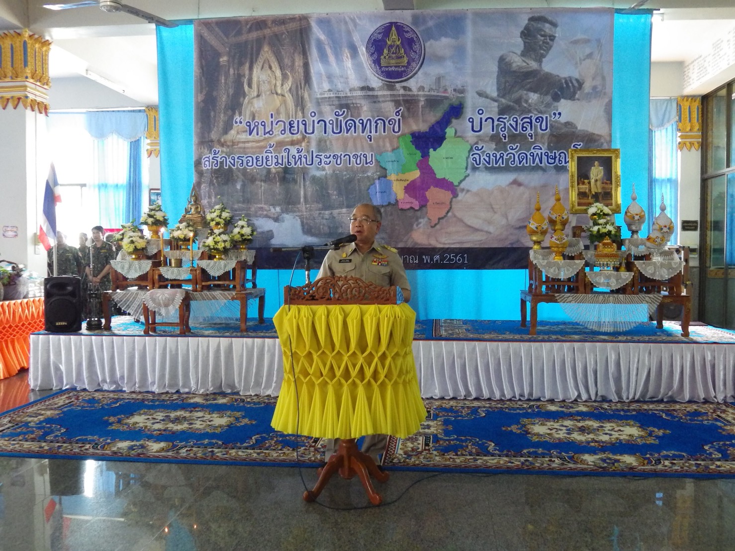 วันที่ 15 พฤษภาคม 2561 เวลา 08.00-12.00 น. นายบัณฑิต วงศ์เสนานุรักษ์ ผอ.ส่วนโครงการพระราชดำริและกิจการพิเศษ สจป.ที่ 4 สาขาพิษณุโลก พร้อมด้วยเจ้าหน้าที่ศูนย์การเรียนรู้ด้านทรัพยากรธรรมชาติและสิ่งแวดล้อม จ.พิษณุโลก ได้ไปร่วมกิจกรรม หน่วยบำบัดทุกข์ บำรุงสุข สร้างรอยยิ้มให้ประชาชน ประจำปีงบประมาณ พ.ศ.2561 ประจำเดือนพฤษภาคม 2561 ณ วัดสนามคลีตะวันตก หมู่ที่ 2 ต.สนามคลี อ.บางกระทุ่ม จ.พิษณุโลก โดยมีนายภัคพงศ์ ทวิพัฒน์ ผวจ.พิษณุโลก เป็นประธานในพิธี นายบุญเหลือ บารมี นายอำเภอบางกระทุ่ม กล่าวรายงาน ผู้ร่วมงานได้แก่นางสิทธินีย์ ทวิพัฒน์ นายกเหล่ากาชาด จ.พิษณุโลก นายฐานุพงศ์ เจริญสุรภิรมย์ รอง. ผวจ.พิษณุโลก หัวหน้าส่วนราชการ หัวหน้าหน่วยงานรัฐวิสาหกิจ ผู้นำท้องที่ ผู้นำท้องถิ่น ข้าราชการ และประชาชน