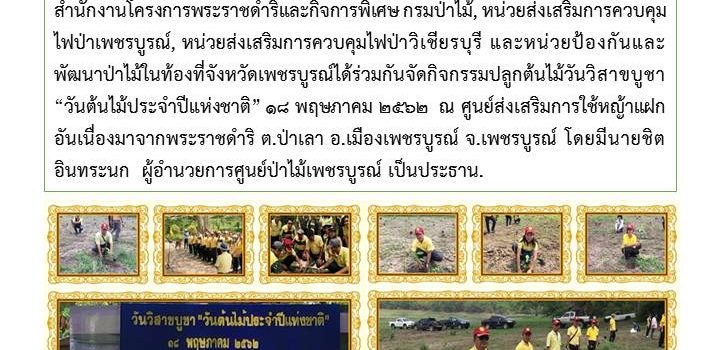 วันที่ ๑๘ พ.ค.๖๒ ศูนย์ป่าไม้เพชรบูรณ์ ร่วมกับศูนย์ส่งเสริมการใช้หญ้าแฝกอันเนื่องมาจากพระราชดำริ จังหวัดเพชรบูรณ์ สำนักงานโครงการพระราชดำริและกิจการพิเ […] ศูนย์ป่าไม้เพชรบูรณ์ ร่วมกับศูนย์ส่งเสริมการใช้หญ้าแฝกอันเนื่องมาจากพระราชดำริ จังหวัดเพชรบูรณ์ สำนักงานโครงการพระราชดำริและกิจการพิเศษ กรมป่าไม้, หน่วยส่งเสริมการควบคุมไฟป่าเพชรบูรณ์, หน่วยส่งเสริมการควบคุมไฟป่าวิเชียรบุรี และหน่วยป้องกันและพัฒนาป่าไม้ในท้องที่จังหวัดเพชรบูรณ์ได้ร่วมกันจัดกิจกรรมปลูกต้นไม้วันวิสาขบูชา “วันต้นไม้ประจำปีแห่งชาติ”