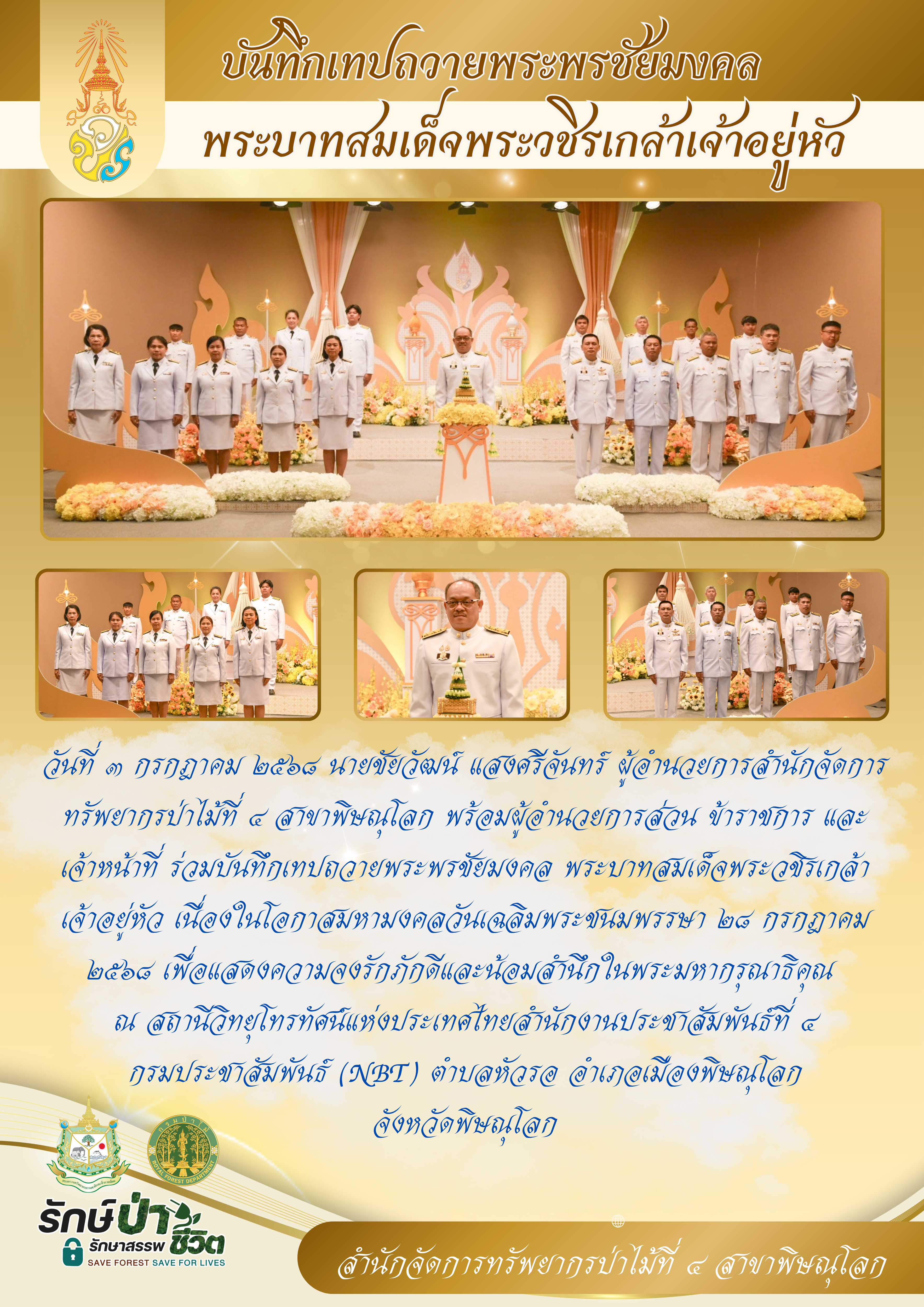 วันที่ 4 กรกฎาคม 2568 เวลา 07.00 น. นายชัยวัฒน์ แสงศรีจันทร์ ผู้อำนวยการสำนักจัดการทรัพยากรป่าไม้ที่ 4 สาขาพิษณุโลก มอบหมายให้ นางสาวพรพรรณ มากดวงจันท […] พิธีถวายพระพรชัยมงคล และตักบาตรถวายพระราชกุศล เนื่องในวันคล้ายวันประสูติ สมเด็จพระเจ้าน้องนางเธอ เจ้าฟ้าจุฬาภรณวลัยลักษณ์ อัครราชกุมารี