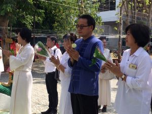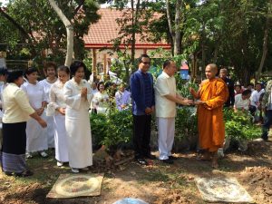 วันที่ 10 พฤษภาคม 2560 เวลา 08.10 -11.00 น. นายบัณฑิต วงศ์เสนานุรักษ์ ผอ.ส่วนโครงการพระราชดำริและกิจการพิเศษ และทำหน้าที่หัวหน้าศูนย์การเรียนรู้ด้านทรัพยากรธรรมชาติและสิ่งแวดล้อมจังหวัดพิษณุโลก สจป.ที่ 4 สาขาพิษณุโลก ไปร่วมในพิธีวันวิสาขบูชา และวันต้นไม้ประจำปีของชาติ พ.ศ.2560 โดยมีนายธัชชัย สีสุวรรณ รอง ผวจ.พิษณุโลก เป็นประธานในพิธี มีกิจกรรมสวดมนต์ บรรยายความรู้ด้านป่าไม้ สิ่งแวดล้อม การปลูกป่าในชุมชน ศาสตร์พระราชา ต้นไม้ชนิดต่างๆ ปลูกต้นไม้มงคล และแจกกล้าไม้ 3 อย่าง ประโยชน์ 4 อย่าง ให้แก่ชุมชนเพื่อนำไปปลูก ได้แก่ ไม้พะยูง สัก มะค่าโมง กันเกรา ราชพฤกษ์ อินทนิลน้ำ ขี้เหล็กบ้าน แคนา เพกา มะขามป้อม มะนาวแป้นพิจิตร เหลืองปรีดียาธร จำปี จำปา สะเดา รวมทั้งสิ้น 435 ต้น ณ วัดตาปะขาวหาย ต.หัวรอ อ.เมือง จ.พิษณุโลก โดยสำนักงานวัฒนธรรมจังหวัดพิษณุโลก และส่วนโครงการพระราชดำริและกิจการพิเศษ ศูนย์การเรียนรู้ฯ สนับสนุนกล้าไม้ ด้านวิชาการ และดินปลูกต้นไม้ 20 ถุง ผู้ร่วมงานได้แก่ คุณปัทมา เอี่ยมสุวรรณ นายกเหล่ากาชาด รองนายกเหล่ากาชาด พร้อมทีมงาน เหล่ากาชาด และจากหน่วยงานฯ ต่างๆ พร้อมด้วยผู้มาร่วมทำบุญที่วัด