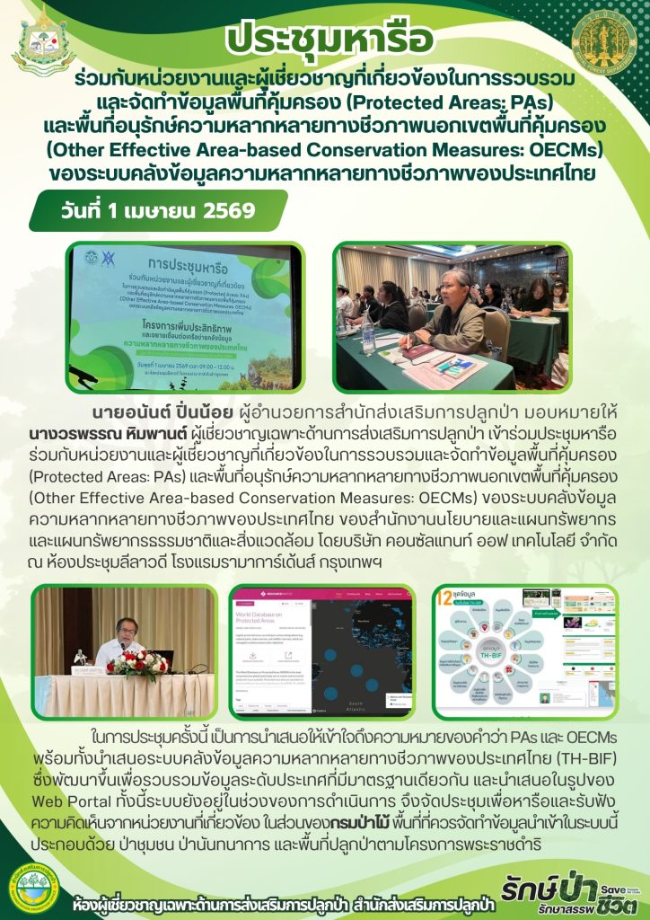 วันที่ 1 เมษายน 2569 ประชุมหารือร่วมกับหน่วยงานและผู้เชี่ยวชาญที่เกี่ยวข้องในการรวบรวมและจัดทำข้อมูลพื้นที่คุ้มครอง (Protected Areas: PAs) และพื้นที่อนุรักษ์ความหลากหลายทางชีวภาพนอกเขตพื้นที่คุ้มครอง (Other Effective Area-based Conservation Measures: OECMs) ของระบบคลังข้อมูลความหลากหลายทางชีวภาพของประเทศไทย Leave a comment Post Views: 5