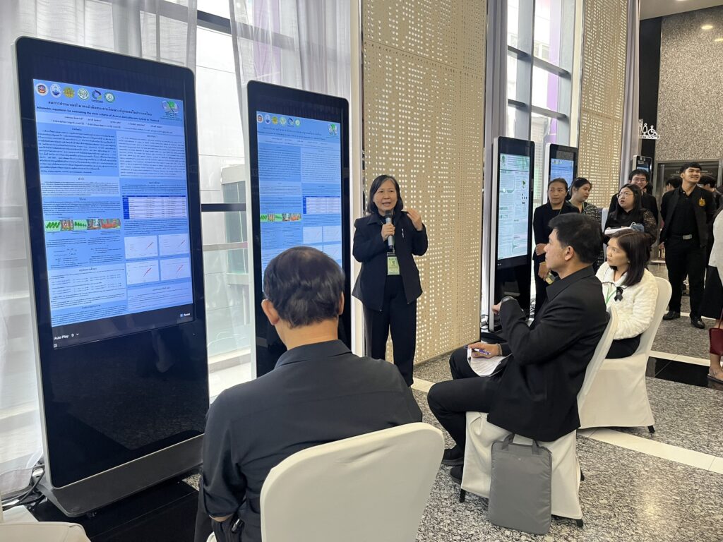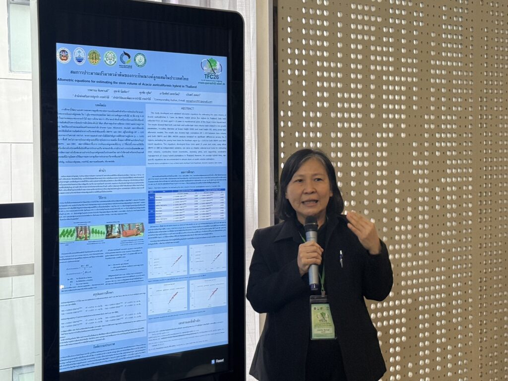 - สำหรับในแต่ละวันของการจัดประชุมจะมีการนำเสนอผลงานวิชาการจากผู้ทรงคุณวุฒิ โดยการบรรยาย การเสวนาเชิงนโยบาย และการจัดแสดงโปสเตอร์ทางวิชาการ ซึ่งนางวรพรรณ ได้นําเสนอผลงานทางวิชาการภาคโปสเตอร์ สาขาวนวัฒนวิทยา และเศรษฐกิจการป่าไม้ ใน“หัวข้อ สมการประมาณปริมาตรลําต้นของกระถินณรงค์ในประเทศไทย” อีกด้วย