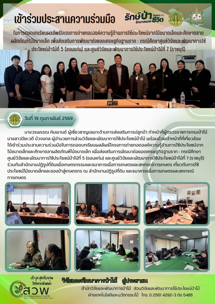 วันที่ 19 กุมภาพันธ์ 2569 เข้าร่วมสำนักวิจัยและพัฒนาการป่าไม้ ในการหารือเรื่องแนวทางการดำเนินงานและขยายงานความร่วมมือเรื่องการส่งเสริมการปลูกไม้เศรษฐกิจระหว่างกรมป่าไม้กับสำนักงานการปฏิรูปที่ดินเพื่อเกษตรกรรม และธนาคารเพื่อการเกษตรและสหกรณ์การเกษตร Leave a comment