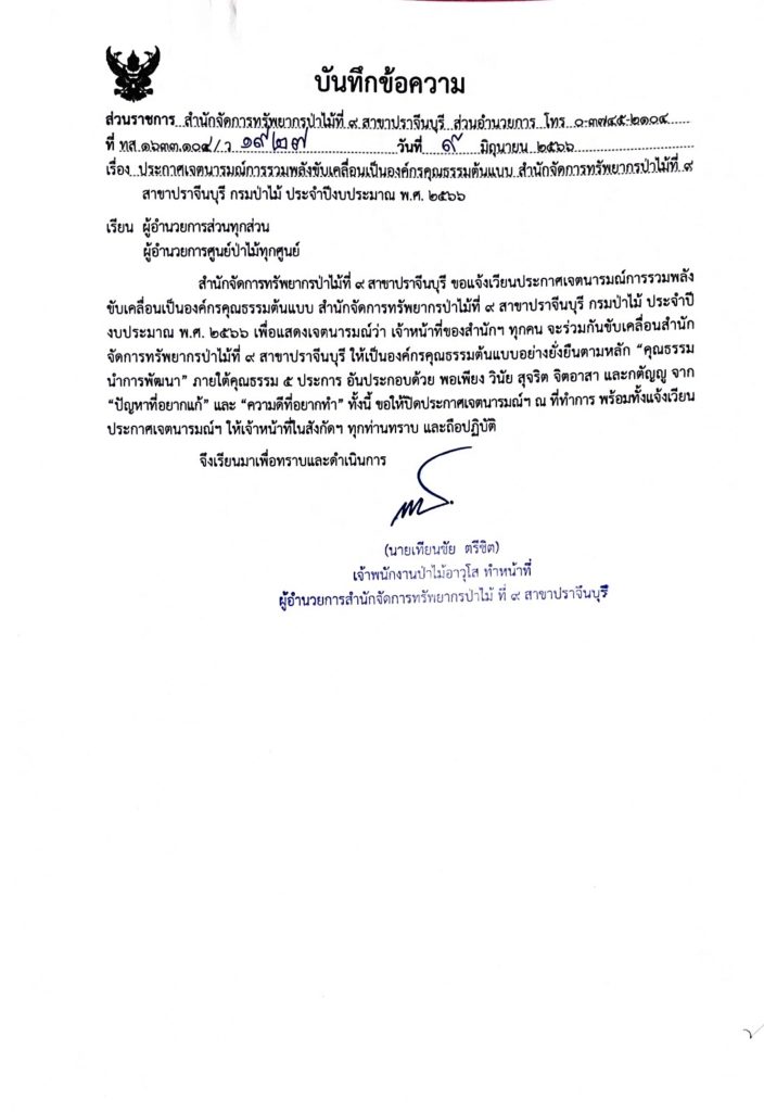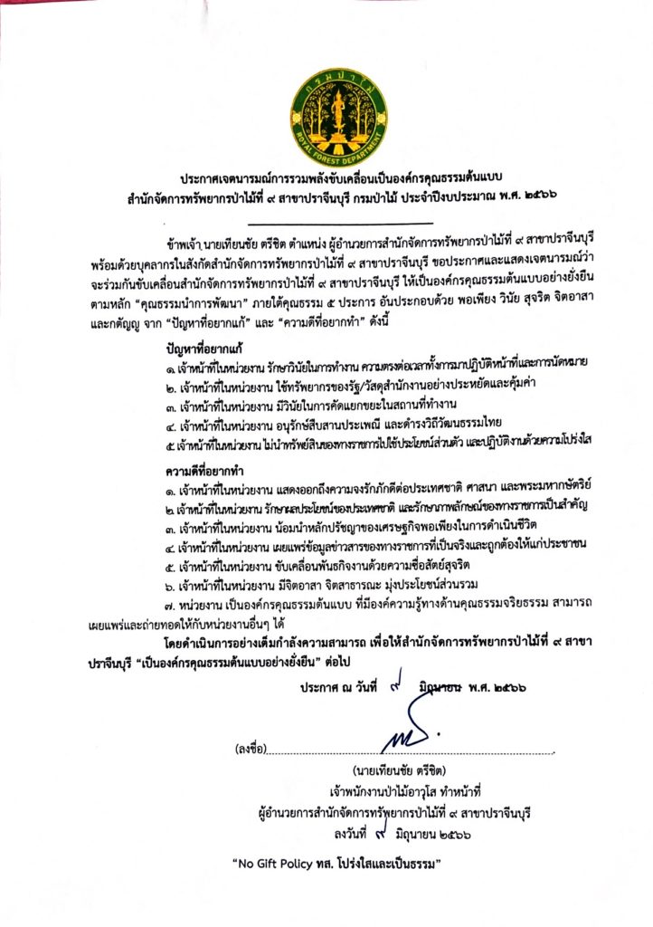 ประกาศเจตนารมณ์การรวมพลังขับเคลื่อนเป็นองค์กรคุณธรรมต้นแบบ12 มิถุนายน 2023 by ntzforest ประกาศเจตนารมณ์การรวมพลังขับเคลื่อนเป็นองค์กรคุณธรรมต้นแบบ สำนักจัดการทรัพยากรป่าไม้ที่ ๙ สาขาปราจีนบุรี กรมป่าไม้ ประจำปีงบประมาณ พ.ศ. ๒๕๖๖