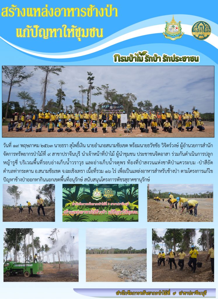 ตำบลท่ากระดาน อ.สนามชัยเขต จ.ฉะเชิงเทรา เนื้อที่รวม 16 ไร่ เพื่อเป็นแหล่งอาหารสำหรับช้างป่า ตามโครงการแก้ไขปัญหาช้างป่าออกหากินนอกเขตพื้นที่อนุรักษ์ สนับสนุนโครงการพัชรสุธาคชานุรักษ์