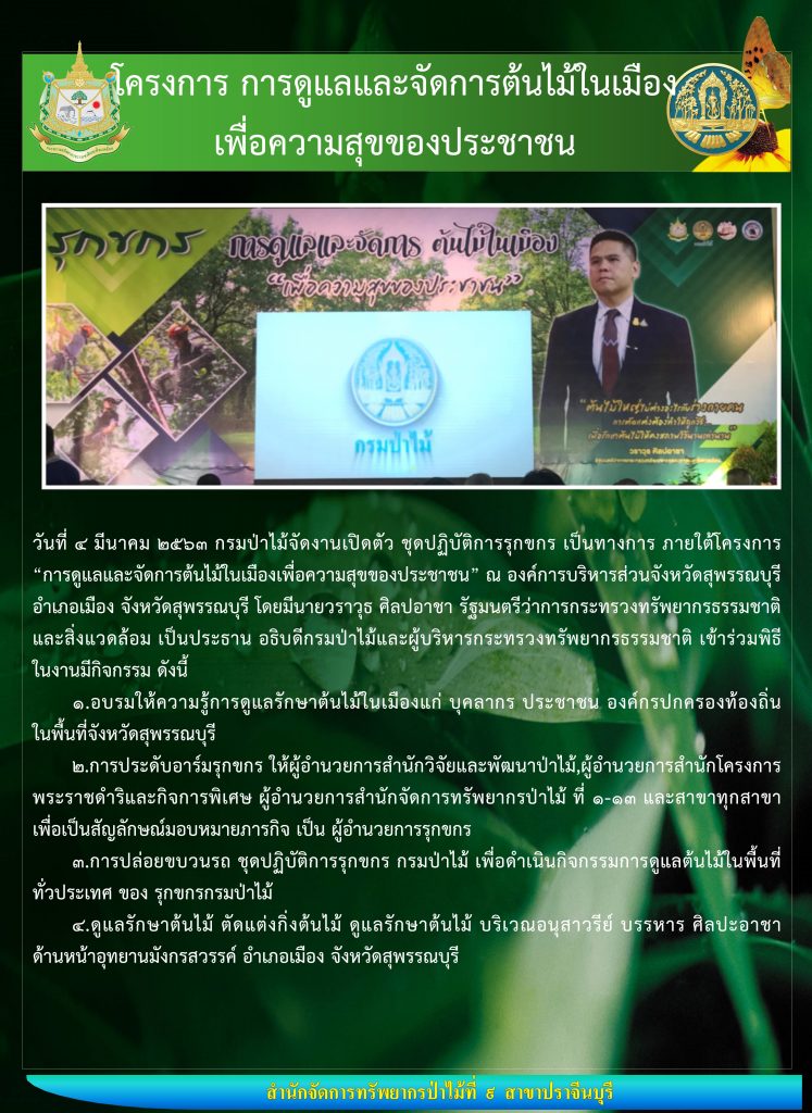 วันที่ 4 มีนาคม 2563 เวลา 09.00 น. นายธวัชชัย วิจิตร์วงษ์ ผู้อำนวยการสำนักจัดการทรัพยากรป่าไม้ที่ 9 สาขาปราจีนบุรี พร้อม นายเทียนชัย ตรีชิต ผู้อำนวยการส่วนส่งเสริมการป่าไม้ ได้เข้าร่วมงานโครงการ การดูแลและจัดการต้นไม้ในเมืองเพื่อความสุขของประชาชน เพื่อพัฒนาทักษะ และความชำนาญในการตัดแต่ง บำรุงรักษาต้นไม้ใหญ่ในเมือง เพื่อเป็นต้นแบบในการจัดการต้นไม้ในเมือง ตลอดจนการพัฒนาสิ่งแวดล้อมของประชาชน ชุมชนและประเทศชาติต่อไป โดยมีนายวราวุธ ศิลปะอาชา รัฐมนตรีว่าการกระทรวงทรัพยากรธรรมชาติและสิ่งแวดล้อม เป็นประธานในการเปิดพิธี นายอรรถพล เจริญชันษา อธิบดีกรมป่าไม้ เป็นผู้กล่าวรายงาน ทั้งนี้ท่านรัฐมนตรีว่าการกระทรวงทรัพยากรธรรมชาติและสิ่งแวดล้อม ได้ทำพิธีประดับอาร์มและรับมอบอาร์ม “รุกขกร กรมป่าไม้” ตลอดจนพิธีปล่อยขบวนรถ “รุกขกร กรมป่าไม้” ณ ห้องประชุมองค์การบริหารส่วนจังหวัดสุพรรณบุรี จังหวัดสุพรรณบุรี