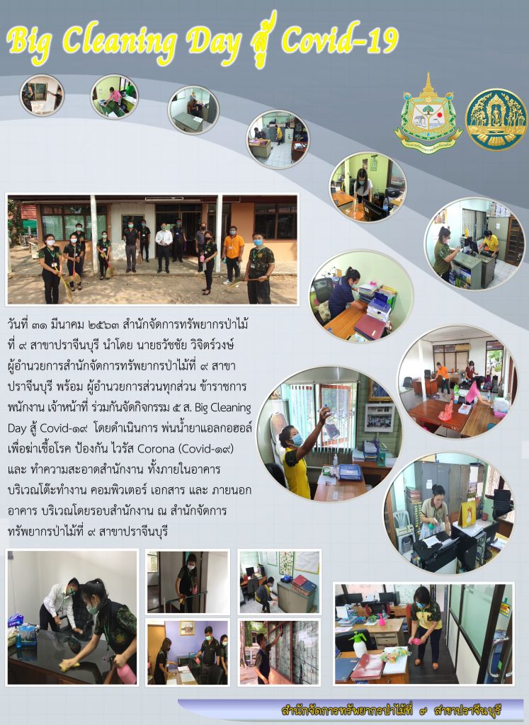 วันที่ 31 มีนาคม ๒๕๖๓ สำนักจัดการทรัพยากรป่าไม้ที่ 9 สาขาปราจีนบุรี นำโดย นายธวัชชัย วิจิตร์วงษ์ ผู้อำนวยการสำนักจัดการทรัพยากรป่าไม้ที่ ๙ สาขาปราจีนบุรี พร้อม ผู้อำนวยการส่วนทุกส่วน ข้าราชการ พนักงาน เจ้าหน้าที่ ร่วมกันจัดกิจกรรม 5 ส. Big Cleaning Day สู้ Covid-19 โดยดำเนินการ พ่นน้ำยาแอลกอฮอล์เพื่อฆ่าเชื้อโรค ป้องกัน ไวรัส Corona (Covid-19) และ ทำความสะอาดสำนักงาน ทั้งภายในอาคาร บริเวณโต๊ะทำงาน คอมพิวเตอร์ เอกสาร และ ภายนอกอาคาร บริเวณโดยรอบสำนักงาน ณ สำนักจัดการทรัพยากรป่าไม้ที่ 9 สาขาปราจีนบุรี
