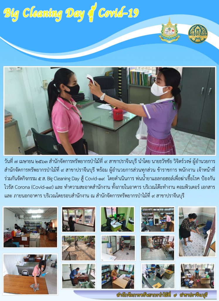 วันที่ 7 เมษายน ๒๕๖๓ สำนักจัดการทรัพยากรป่าไม้ที่ 9 สาขาปราจีนบุรี นำโดย นายธวัชชัย วิจิตร์วงษ์ ผู้อำนวยการสำนักจัดการทรัพยากรป่าไม้ที่ ๙ สาขาปราจีนบุรี พร้อม ผู้อำนวยการส่วนทุกส่วน ข้าราชการ พนักงาน เจ้าหน้าที่ ร่วมกันจัดกิจกรรม 5 ส. Big Cleaning Day สู้ Covid-19 โดยดำเนินการ พ่นน้ำยาแอลกอฮอล์เพื่อฆ่าเชื้อโรค ป้องกัน ไวรัส Corona (Covid-19) และ ทำความสะอาดสำนักงาน ทั้งภายในอาคาร บริเวณโต๊ะทำงาน คอมพิวเตอร์ เอกสาร และ ภายนอกอาคาร บริเวณโดยรอบสำนักงาน ณ สำนักจัดการทรัพยากรป่าไม้ที่ 9 สาขาปราจีนบุรี