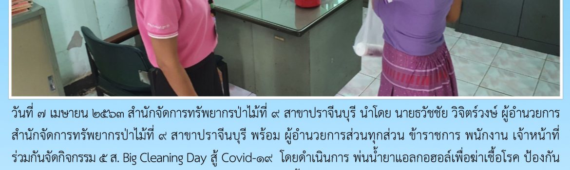 วันที่ 7 เมษายน ๒๕๖๓ สำนักจัดการทรัพยากรป่าไม้ที่ 9 สาขาปราจีนบุรี นำโดย นายธวัชชัย วิจิตร์วงษ์ ผู้อำนวยการสำนักจัดการทรัพยากรป่าไม้ที่ ๙ สาขาปราจีนบุรี พร้อม ผู้อำนวยการส่วนทุกส่วน ข้าราชการ พนักงาน เจ้าหน้าที่ ร่วมกันจัดกิจกรรม 5 ส. Big Cleaning Day สู้ Covid-19 โดยดำเนินการ พ่นน้ำยาแอลกอฮอล์เพื่อฆ่าเชื้อโรค ป้องกัน ไวรัส Corona (Covid-19) และ ทำความสะอาดสำนักงาน ทั้งภายในอาคาร บริเวณโต๊ะทำงาน คอมพิวเตอร์ เอกสาร และ ภายนอกอาคาร บริเวณโดยรอบสำนักงาน ณ สำนักจัดการทรัพยากรป่าไม้ที่ 9 สาขาปราจีนบุรี