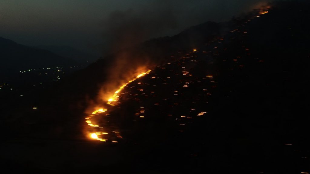 เหตุการณ์ยาวมาถึงช่วง 21.00 น.กำลังเจ้าหน้าที่เข้าป่าอีกครั้ง เพื่อทำแนวกันไฟ ไม่ให้ลุกลามเป็นวงกว้าง กระทั้ง 22.00 น.ราตรีที่ทุกคนนอนหลับไหล ยังมีเจ้าหน้าที่ดับไฟป่า ยังเข้าประจำการในพื้นที่ คอยทำแนวกันไฟไม่ให้ลุกลามเป็นวงกว้าง เข้าพื้นที่บ้านเรือนประชาชน เสียงเครื่องเป่าลม ยังดังกังวานทั่วหมู่บ้าน อย่างต่อเนื่อง เสียงวิทยุที่ดังขึ้นในราว 5 ทุ่มกว่า แจ้งว่า ให้ระวังงูจงอางขนาดใหญ่ในพื้นที่ แต่ทุกคนก็ยังเดินหน้าทำงานจนกว่าภาระกิจจะเสร็จสิ้น นามเรียกขานป้องกัน 1 ก็ยังคงเฝ้ามอนิเตอร์สถานการณ์ไม่ห่าง ค่อยเป็นกำลังใจเจ้าหน้าที่ อำนวยการอยุ่เคียงข้างเจ้าหน้าที่ ทีมอากาศยานไร้คนขับ ยังคงขึ้นบินทุกๆ 2 ชั่วโมง คอยตรวจสอบทางอากาศ เพื่อเเจ้งให้เจ้าหน้าที่ชุดภาคพื้นทราบ ทีมอากาศยานไร้คนขับ ยังคงขึ้นบินทุกๆ 2 ชั่วโมง คอยตรวจสอบทางอากาศ เพื่อเเจ้งให้เจ้าหน้าที่ชุดภาคพื้นทราบ เสียงวิทยุยังคงติดต่อประสานงานกันอย่างไม่ขาดสาย ทุกทีมยังคงปฏิบัติงานอย่างเต็มกำลัง จนกว่าจะพิชิตเปลวเพลิงได้สำเร็จ กระทั้งเสียงวิทยุสื่อสารเงียบลงช่วง 02.20 น. 02.30 อากาศยานไร้คนขับขึ้นบินสำรวจ อีกครั้งพบว่า สามารถควบคุมสถานการณ์ได้เป็นที่เรียบร้อย