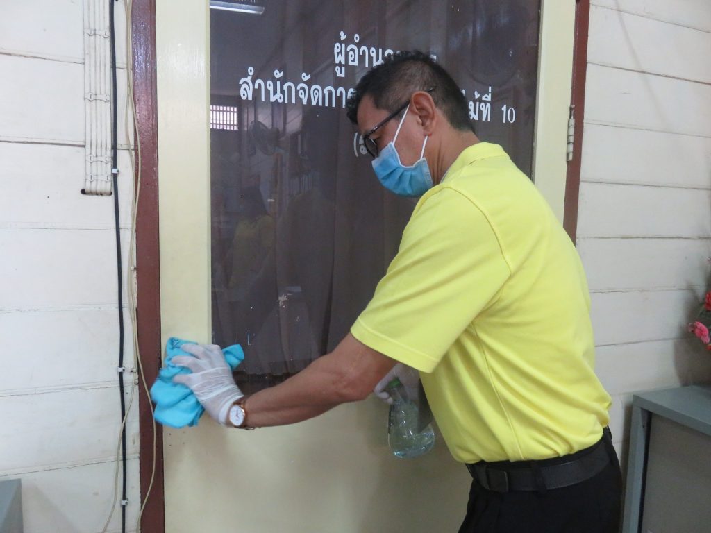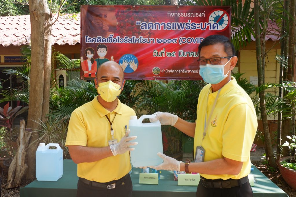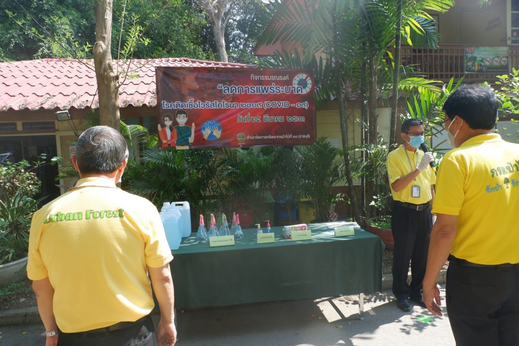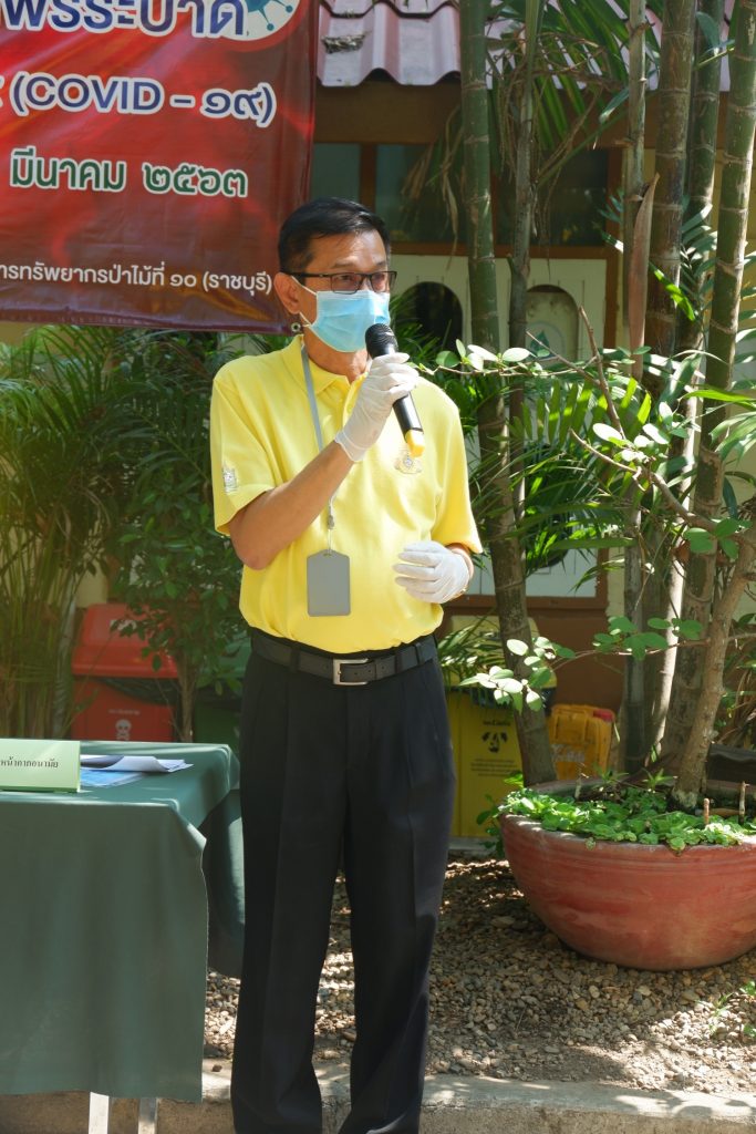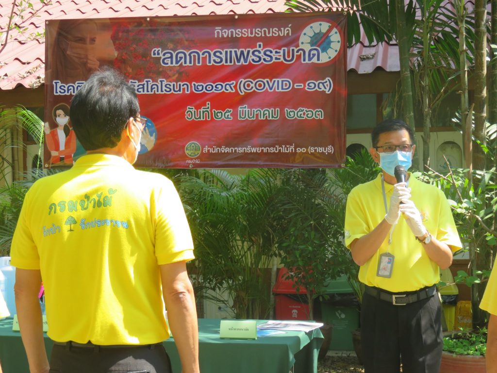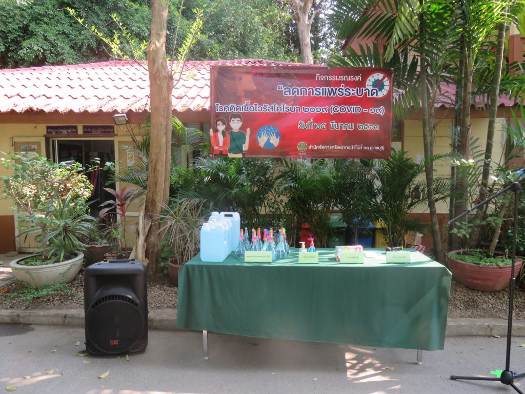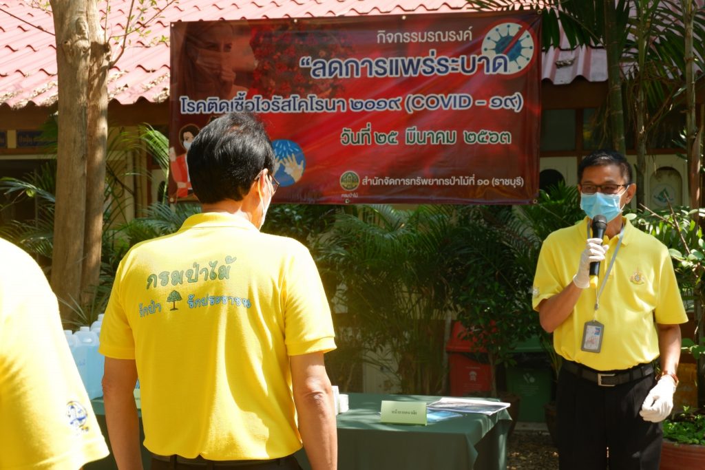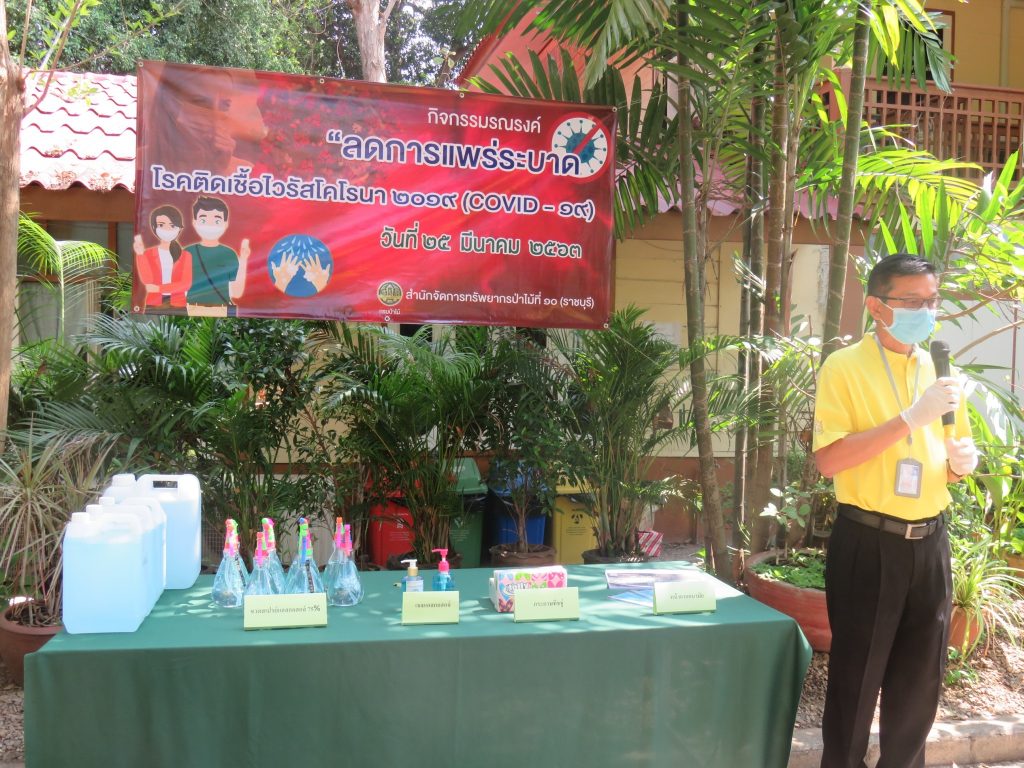 นายนิทรรศ เวชวินิจ ผู้อำนวยการสำนักจัดการทรัพยากรป่าไม้ที่ 10 (ราชบุรี) นำทีมเจ้าหน้าที่สำนักฯ จัดกิจกรรม “ลดการแพร่ระบาดโรคติดเชื้อไวรัสโคโรนา 2019 (COVID-19)” มอบเจลแอลกอฮอล์ 75% ซึ่งได้รับการสนับสนุนจาก บ.ราชบุรีเอทานอล จำกัด จำนวน 45 ลิตร ฉีด พ่น เช็ด ทำความสะอาดอาคารสถานที่ สิ่งของเครื่องใช้ โต๊ะ เก้าอี้ ลูกบิดประตู ราวบันได ห้องน้ำและอุปกรณ์ส่วนกลางที่ใช้ร่วมกัน เพื่อฆ่าเชื้อไวรัส และจัดจุดบริการเจลแอลกอฮอล์ สำหรับให้ผู้ที่มาติดต่อและเจ้าหน้าที่ ฆ่าเชื้อก่อนเข้าสำนักงานทุกครั้ง