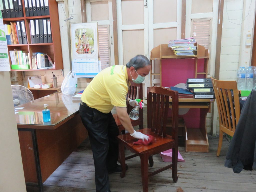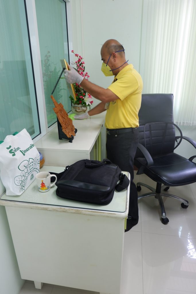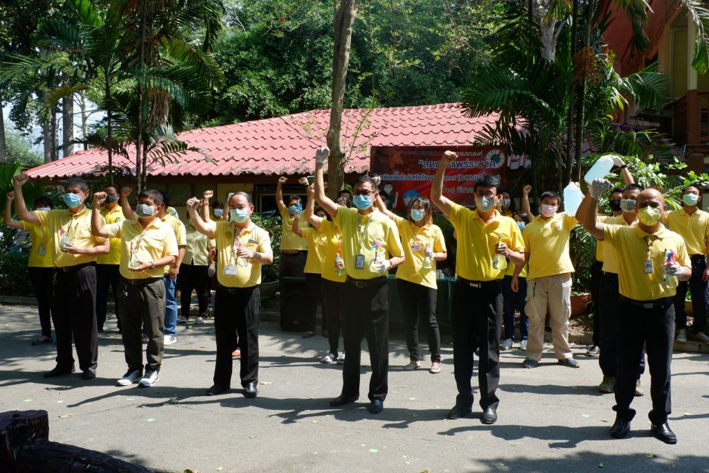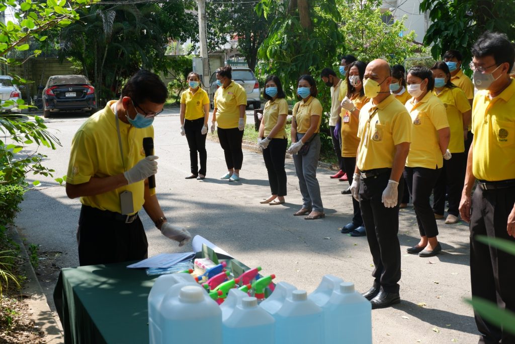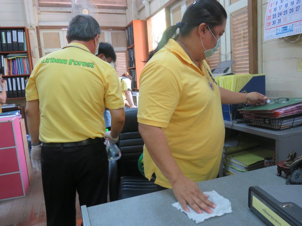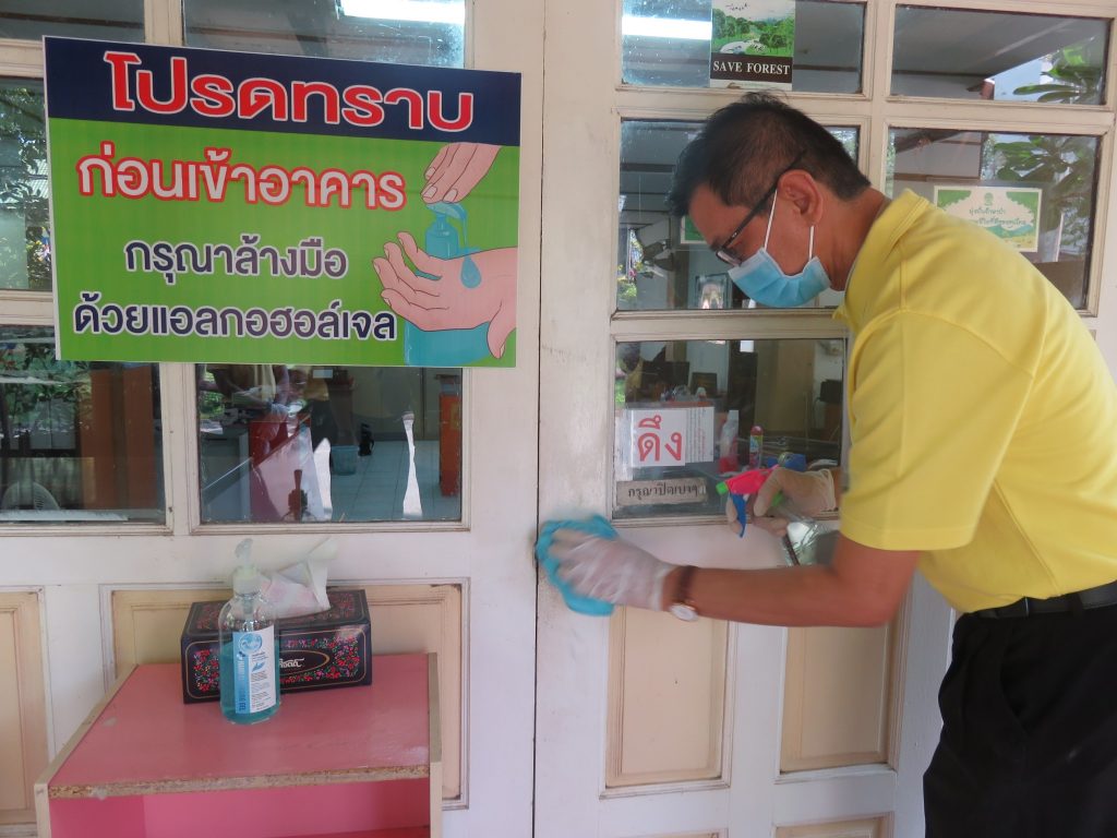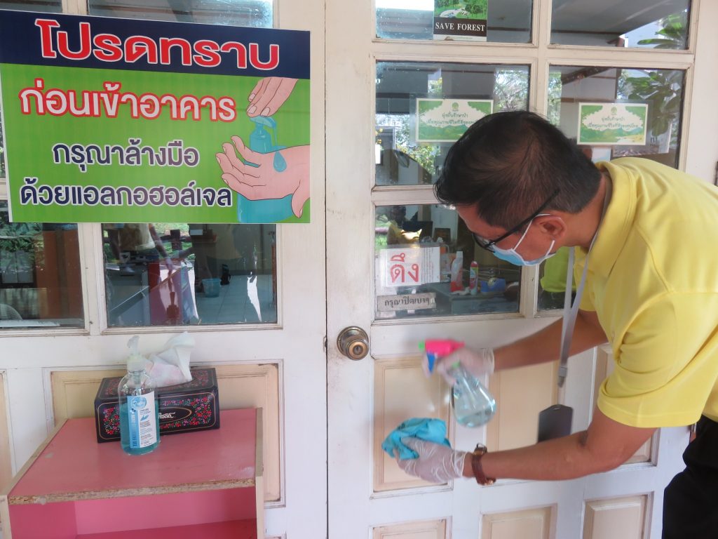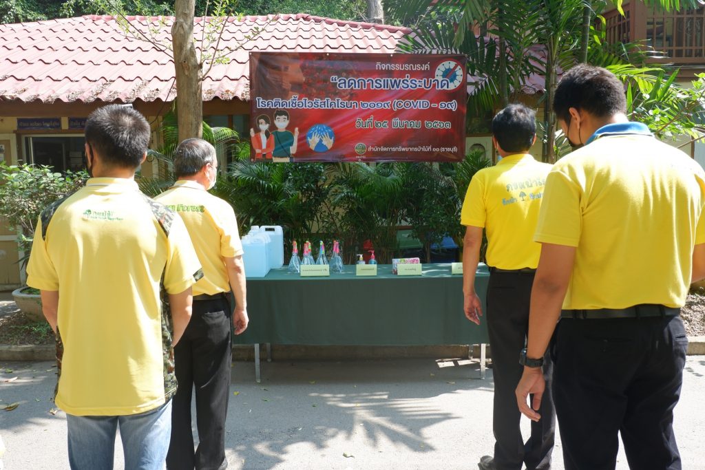 นายนิทรรศ เวชวินิจ ผู้อำนวยการสำนักจัดการทรัพยากรป่าไม้ที่ 10 (ราชบุรี) นำทีมเจ้าหน้าที่สำนักฯ จัดกิจกรรม “ลดการแพร่ระบาดโรคติดเชื้อไวรัสโคโรนา 2019 (COVID-19)” มอบเจลแอลกอฮอล์ 75% ซึ่งได้รับการสนับสนุนจาก บ.ราชบุรีเอทานอล จำกัด จำนวน 45 ลิตร ฉีด พ่น เช็ด ทำความสะอาดอาคารสถานที่ สิ่งของเครื่องใช้ โต๊ะ เก้าอี้ ลูกบิดประตู ราวบันได ห้องน้ำและอุปกรณ์ส่วนกลางที่ใช้ร่วมกัน เพื่อฆ่าเชื้อไวรัส และจัดจุดบริการเจลแอลกอฮอล์ สำหรับให้ผู้ที่มาติดต่อและเจ้าหน้าที่ ฆ่าเชื้อก่อนเข้าสำนักงานทุกครั้ง