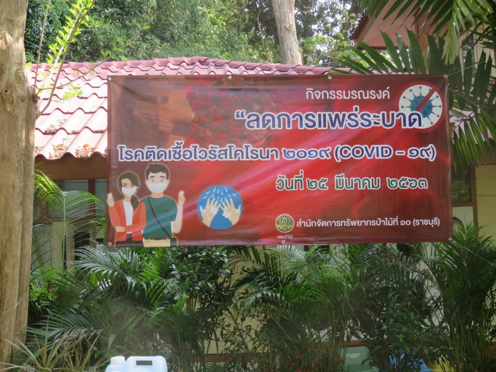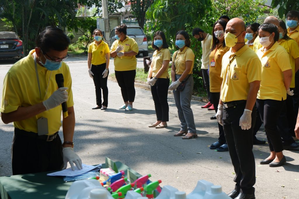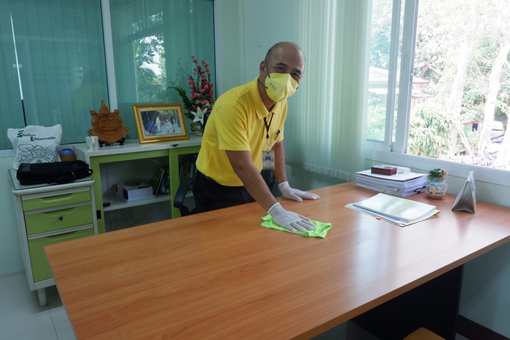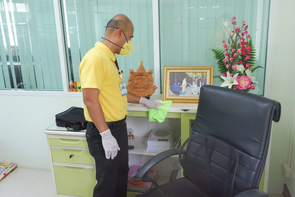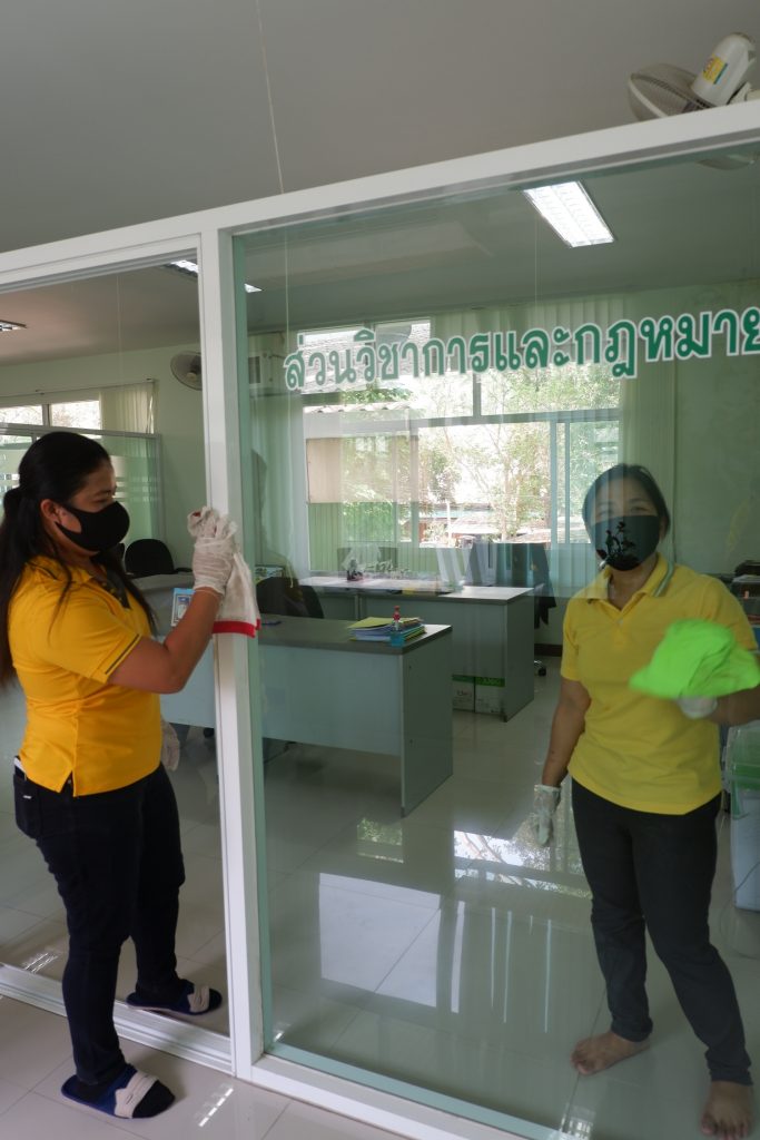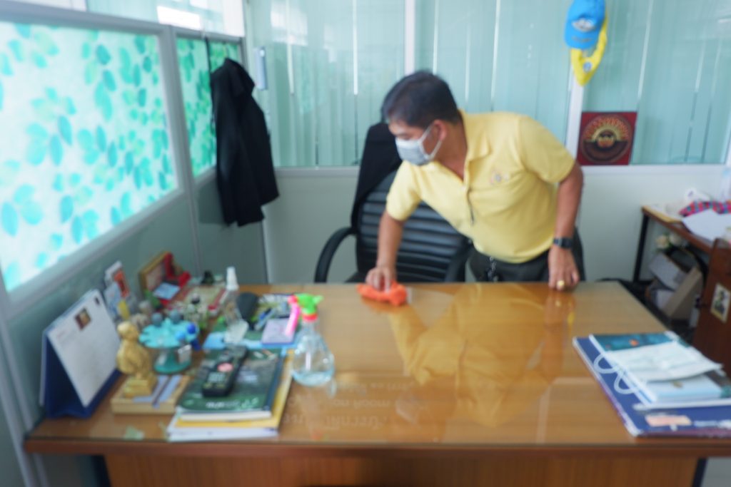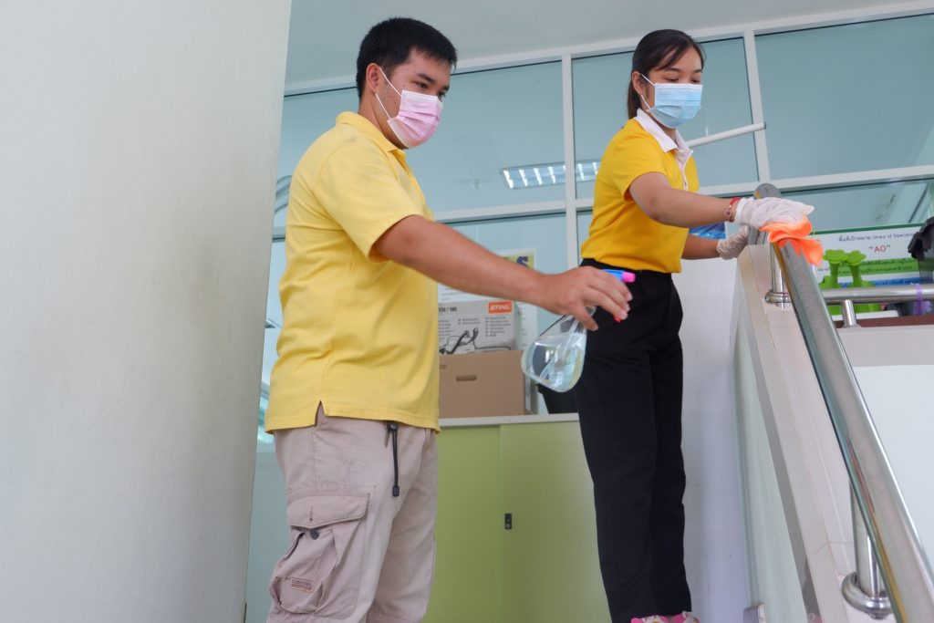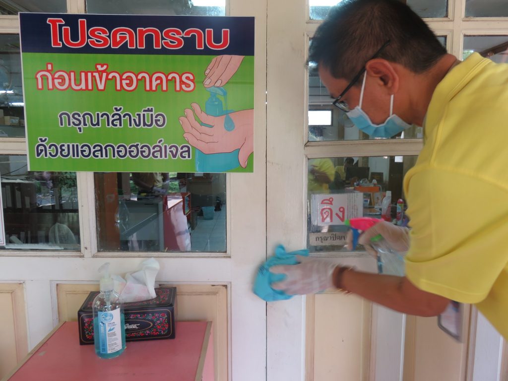 นายนิทรรศ เวชวินิจ ผู้อำนวยการสำนักจัดการทรัพยากรป่าไม้ที่ 10 (ราชบุรี) นำทีมเจ้าหน้าที่สำนักฯ จัดกิจกรรม “ลดการแพร่ระบาดโรคติดเชื้อไวรัสโคโรนา 2019 (COVID-19)” มอบเจลแอลกอฮอล์ 75% ซึ่งได้รับการสนับสนุนจาก บ.ราชบุรีเอทานอล จำกัด จำนวน 45 ลิตร ฉีด พ่น เช็ด ทำความสะอาดอาคารสถานที่ สิ่งของเครื่องใช้ โต๊ะ เก้าอี้ ลูกบิดประตู ราวบันได ห้องน้ำและอุปกรณ์ส่วนกลางที่ใช้ร่วมกัน เพื่อฆ่าเชื้อไวรัส และจัดจุดบริการเจลแอลกอฮอล์ สำหรับให้ผู้ที่มาติดต่อและเจ้าหน้าที่ ฆ่าเชื้อก่อนเข้าสำนักงานทุกครั้ง