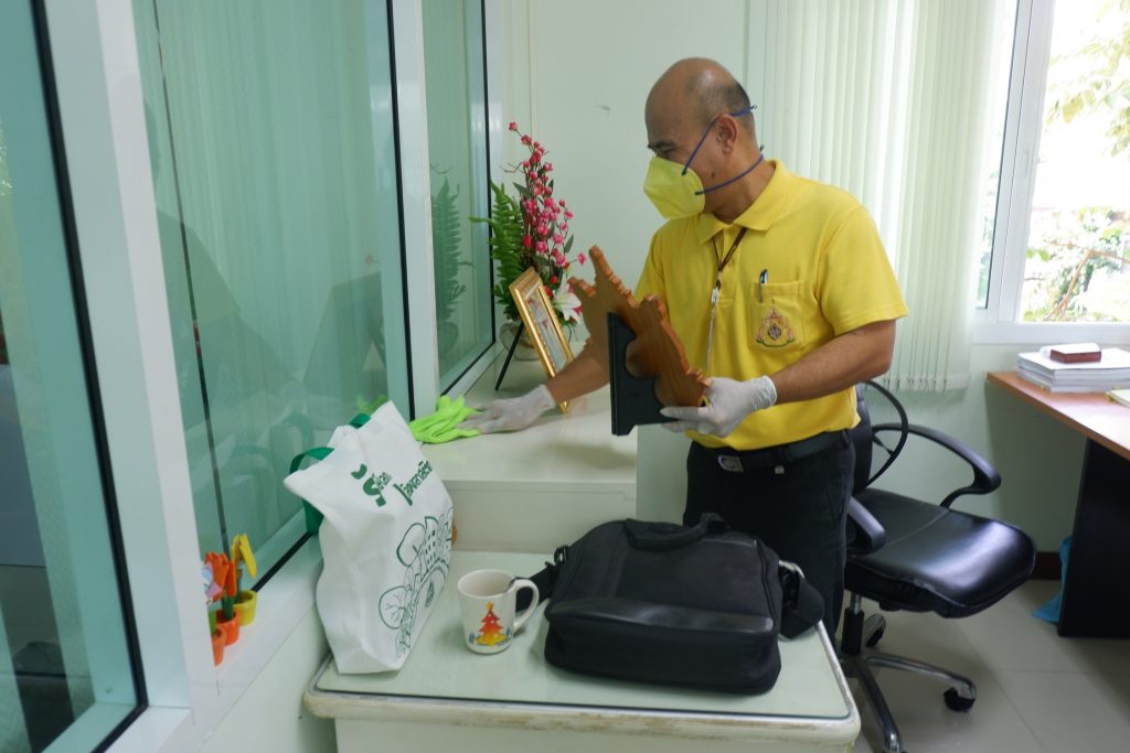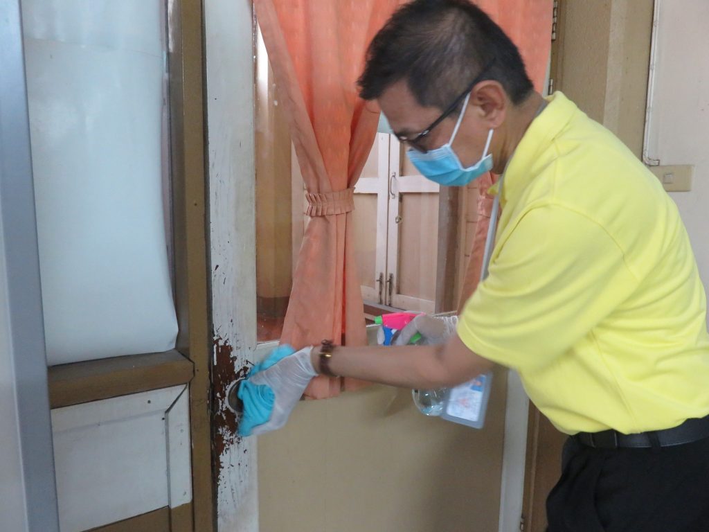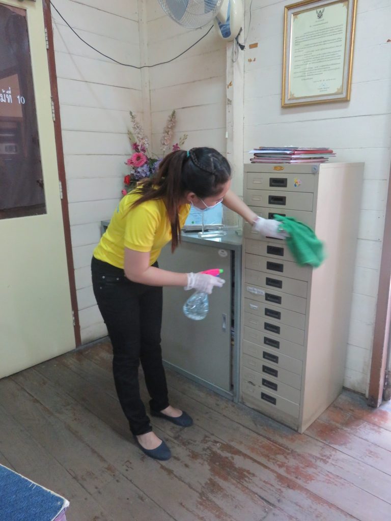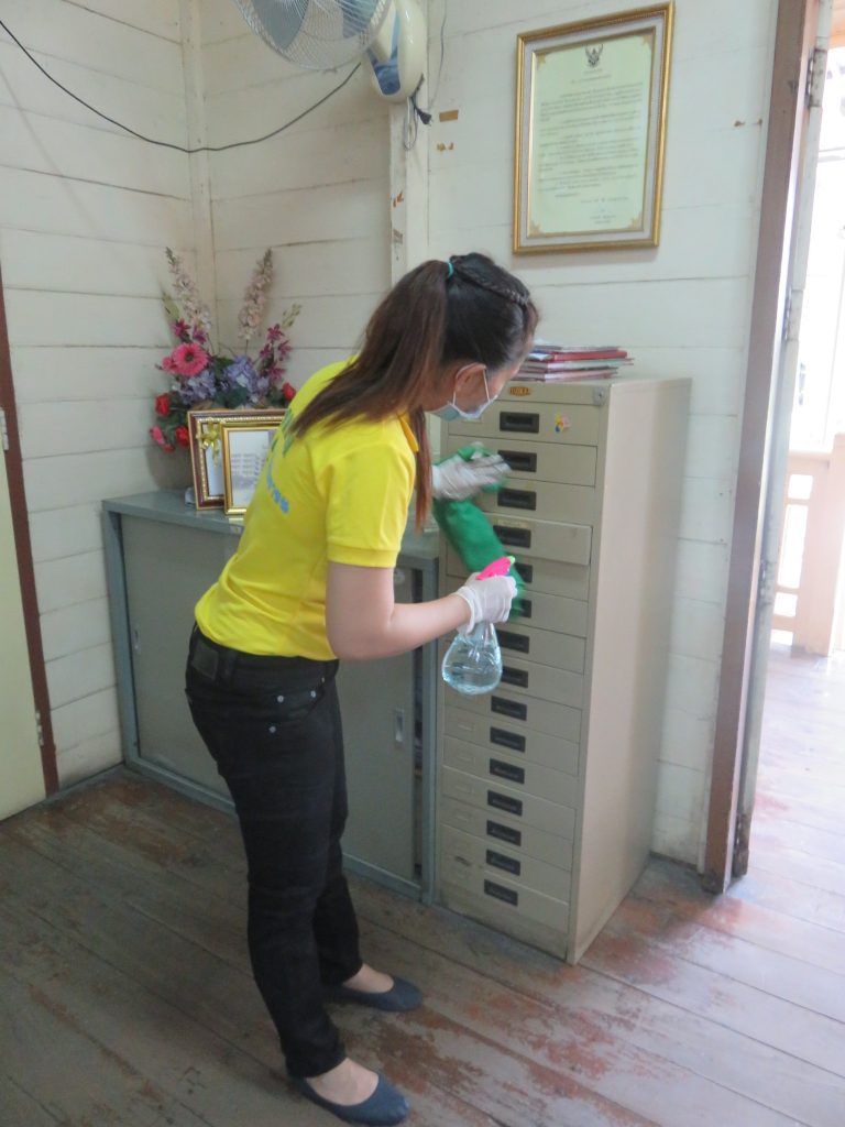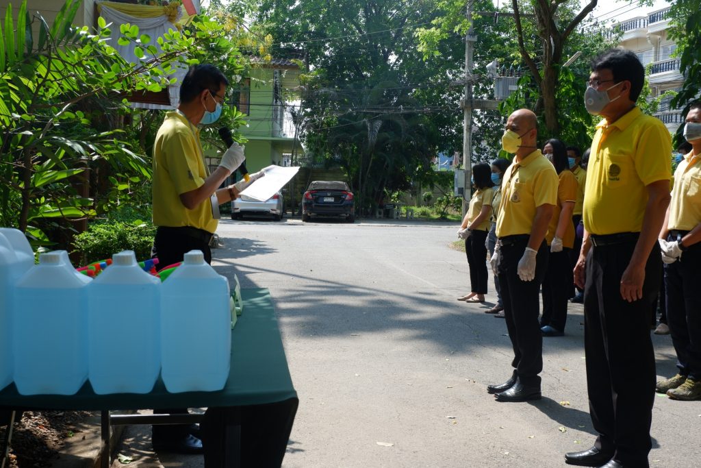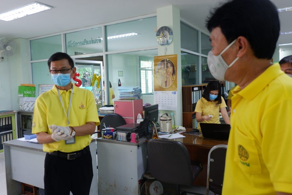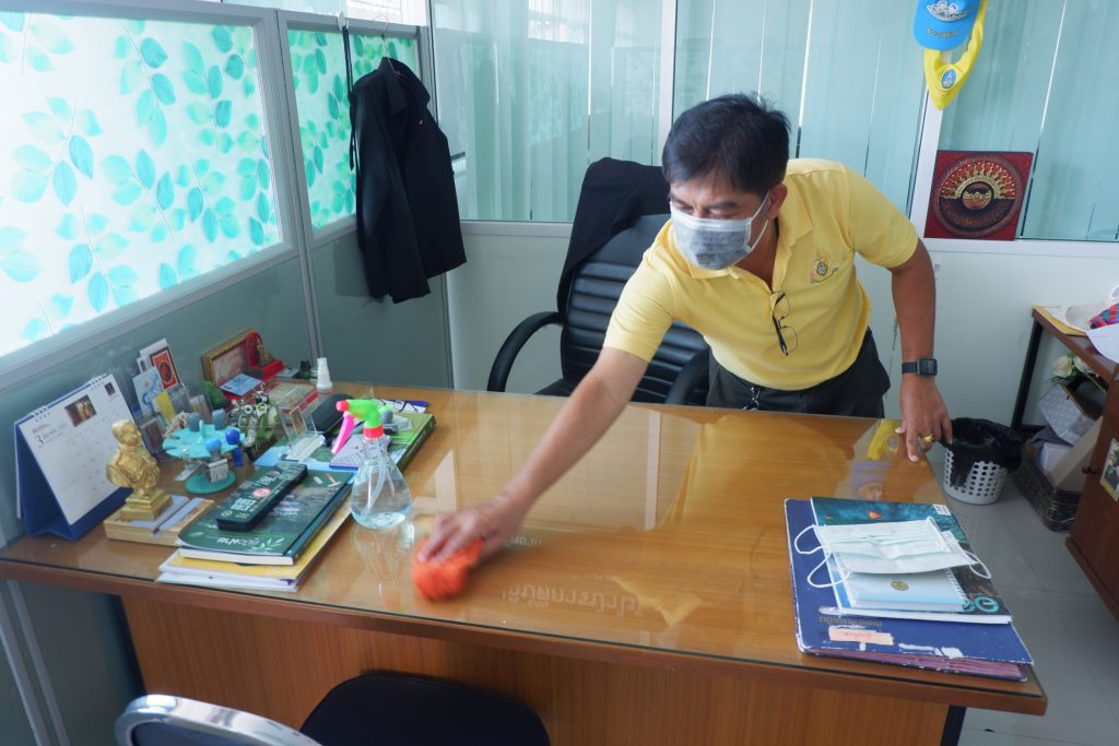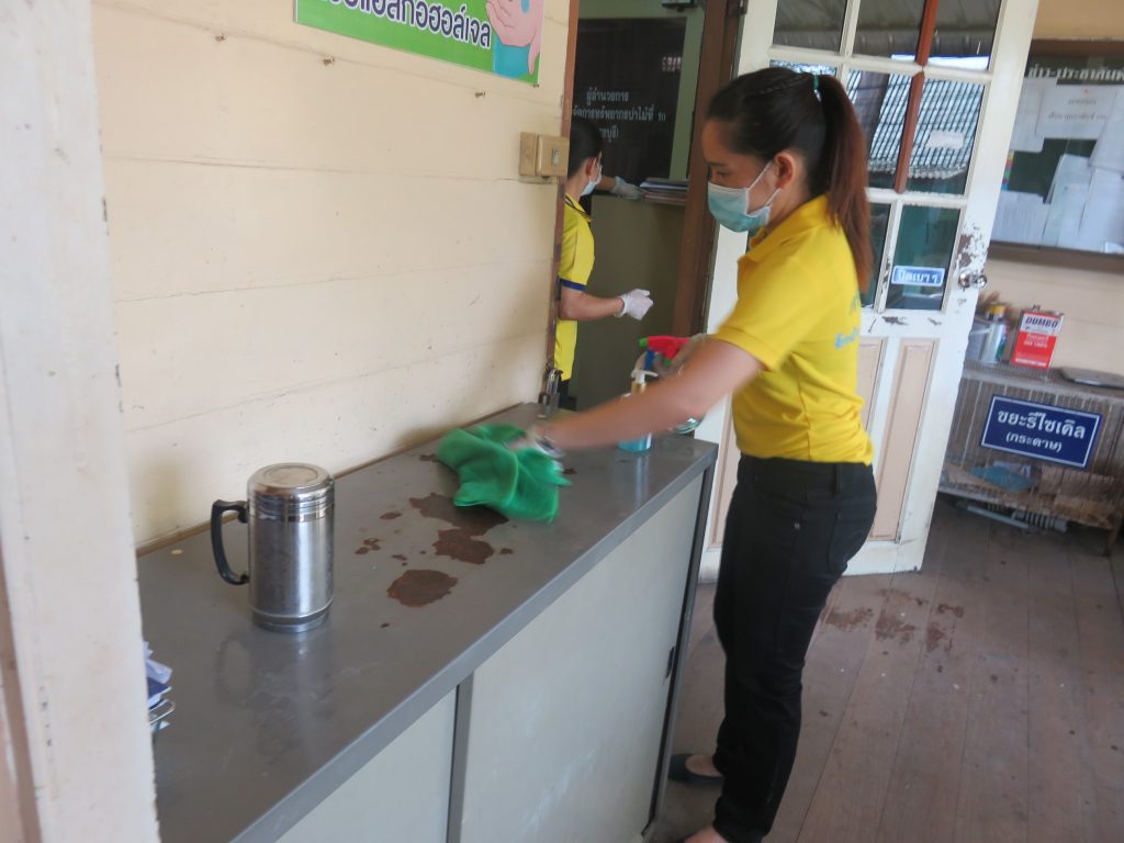 นายนิทรรศ เวชวินิจ ผู้อำนวยการสำนักจัดการทรัพยากรป่าไม้ที่ 10 (ราชบุรี) นำทีมเจ้าหน้าที่สำนักฯ จัดกิจกรรม “ลดการแพร่ระบาดโรคติดเชื้อไวรัสโคโรนา 2019 (COVID-19)” มอบเจลแอลกอฮอล์ 75% ซึ่งได้รับการสนับสนุนจาก บ.ราชบุรีเอทานอล จำกัด จำนวน 45 ลิตร ฉีด พ่น เช็ด ทำความสะอาดอาคารสถานที่ สิ่งของเครื่องใช้ โต๊ะ เก้าอี้ ลูกบิดประตู ราวบันได ห้องน้ำและอุปกรณ์ส่วนกลางที่ใช้ร่วมกัน เพื่อฆ่าเชื้อไวรัส และจัดจุดบริการเจลแอลกอฮอล์ สำหรับให้ผู้ที่มาติดต่อและเจ้าหน้าที่ ฆ่าเชื้อก่อนเข้าสำนักงานทุกครั้ง
