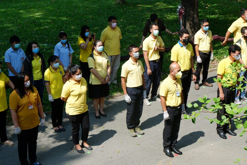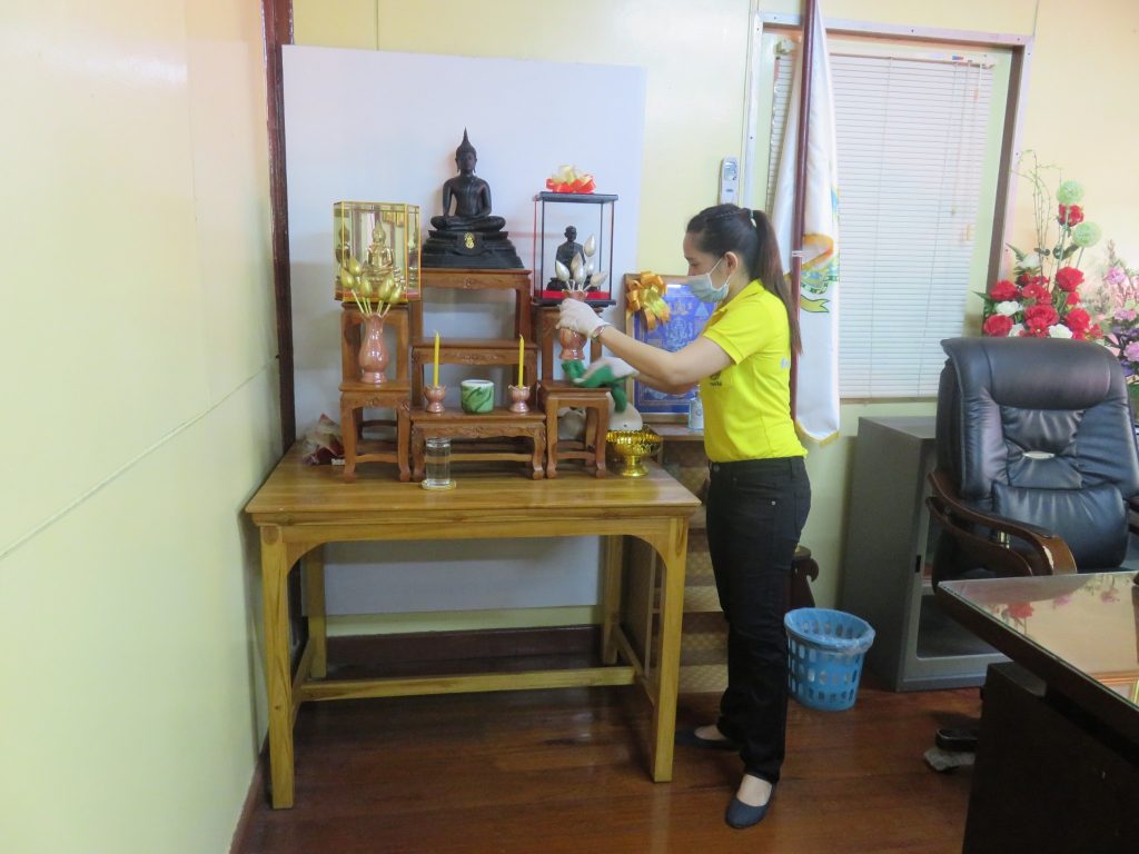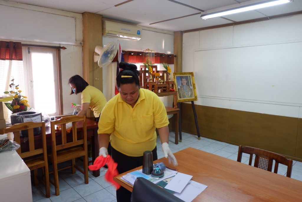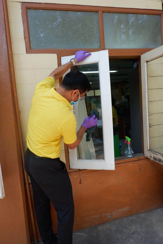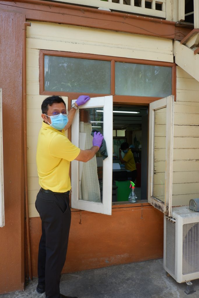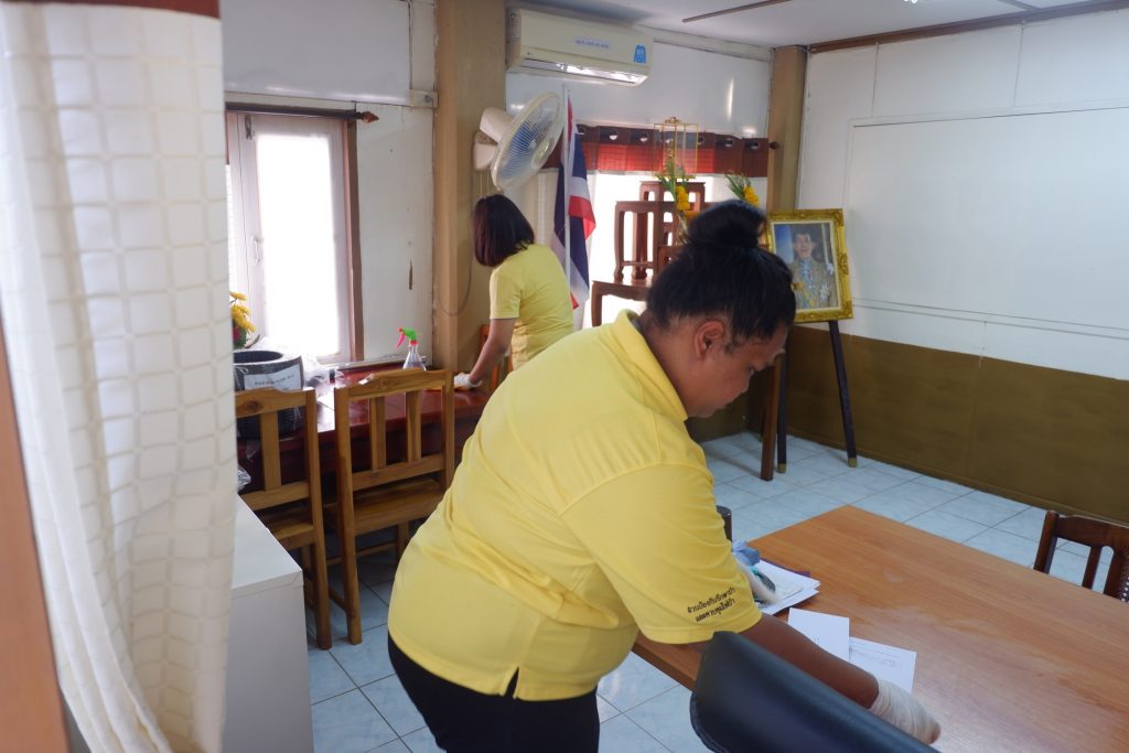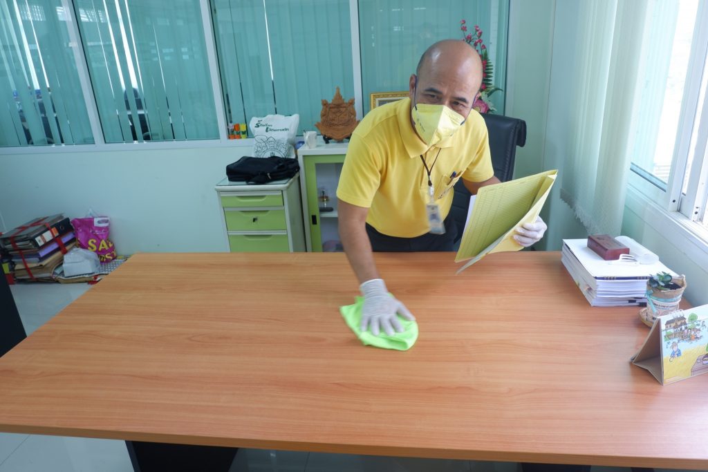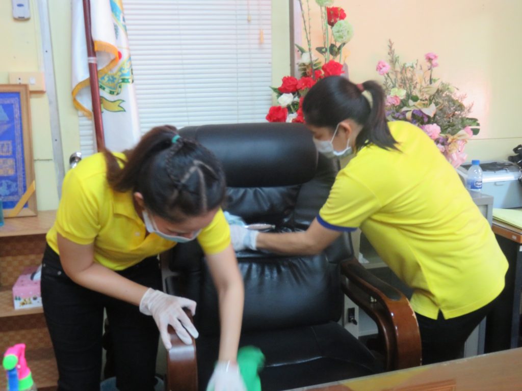 นายนิทรรศ เวชวินิจ ผู้อำนวยการสำนักจัดการทรัพยากรป่าไม้ที่ 10 (ราชบุรี) นำทีมเจ้าหน้าที่สำนักฯ จัดกิจกรรม “ลดการแพร่ระบาดโรคติดเชื้อไวรัสโคโรนา 2019 (COVID-19)” มอบเจลแอลกอฮอล์ 75% ซึ่งได้รับการสนับสนุนจาก บ.ราชบุรีเอทานอล จำกัด จำนวน 45 ลิตร ฉีด พ่น เช็ด ทำความสะอาดอาคารสถานที่ สิ่งของเครื่องใช้ โต๊ะ เก้าอี้ ลูกบิดประตู ราวบันได ห้องน้ำและอุปกรณ์ส่วนกลางที่ใช้ร่วมกัน เพื่อฆ่าเชื้อไวรัส และจัดจุดบริการเจลแอลกอฮอล์ สำหรับให้ผู้ที่มาติดต่อและเจ้าหน้าที่ ฆ่าเชื้อก่อนเข้าสำนักงานทุกครั้ง