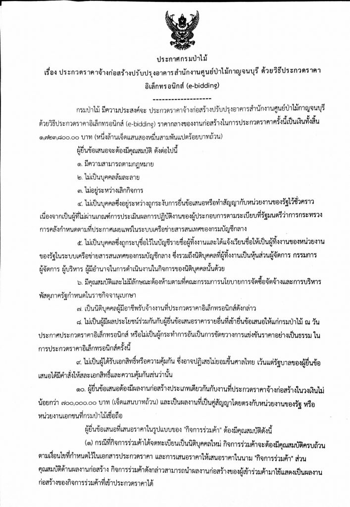 ประกวดราคาจ้างปรับปรุงอาคารสำนักงานศูนย์ป่าไม้กาญจนบุรี ด้วยวิธีประกวดราคาอิเล็กทรอนิกส์