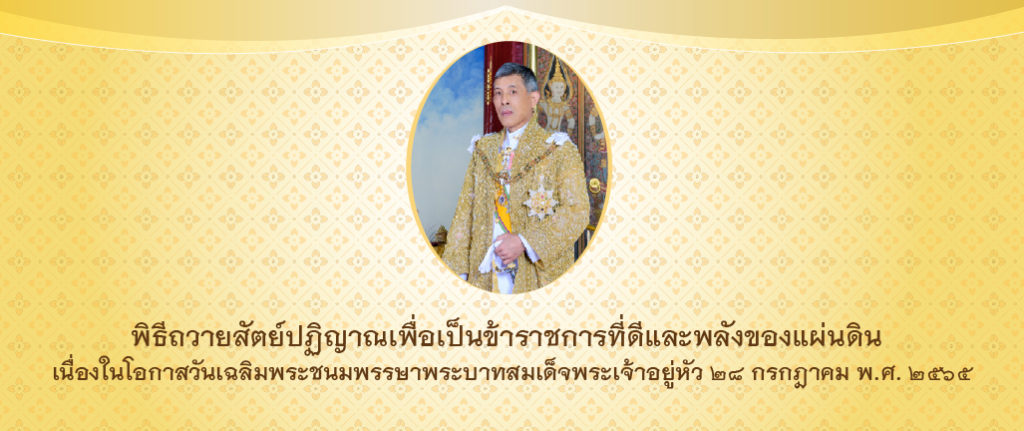 พิธีถวายสัตย์ปฏิญาณเพื่อเป็นข้าราชการที่ดีและพลังของแผ่นดิน ประจำปี ๒๕๖๕ เนื่องในโอกาสวันเฉลิมพระชนมพรรษาพระบาทสมเด็จพระเจ้าอยู่หัว ๒๘ กรกฎาคม ๒๕๖๕ พิธีถวายสัตย์ปฏิญาณเพื่อเป็นข้าราชการที่ดีและพลังของแผ่นดิน ประจำปี ๒๕๖๕ เนื่องในโอกาสวันเฉลิมพระชนมพรรษาพระบาทสมเด็จพระเจ้าอยู่หัว ๒๘ กรกฎาคม ๒๕๖๕