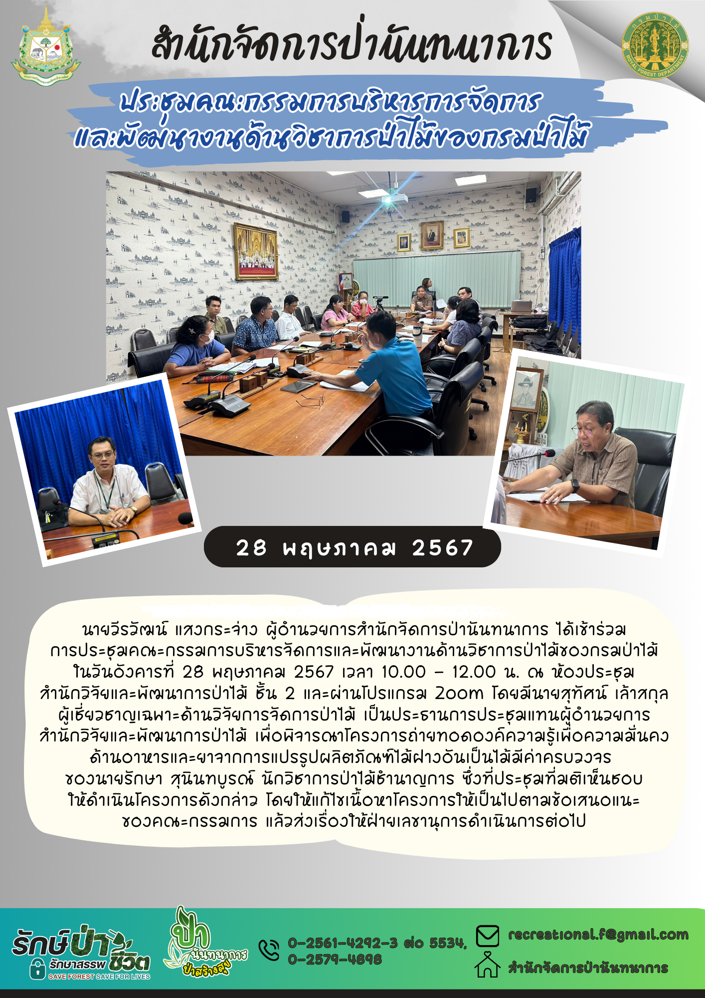 แนะแนวเรื่อง ประชุมรับฟังความคิดเห็น (ร่าง) แผนปฏิบัติการรองรับการเปลี่ยนแปลงสภาพภูมิอากาศของกรมป่าไม้ พ.ศ. 2568-2577 ประชุมเตรียมการชี้แจงงบประมาณรายจ่ายบูรณาการ ประจำปีงบประมาณ พ.ศ. 2568 แผนงานบูรณาการสร้างรายได้จากการท่องเที่ยว