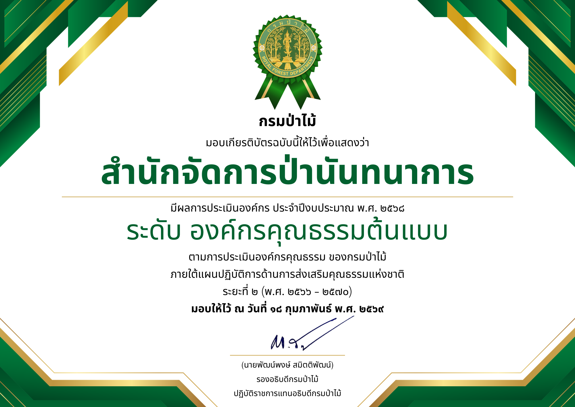 - สำนักจัดการป่านันทนาการ เข้ารับการประเมินองค์กรคุณธรรม ประจำปีงบประมาณ พ.ศ. 2568 และได้รับประกาศการยกย่องเชิดชูและให้บุคลากรได้รับทราบเพื่อเป็นการสร้างขวัญและกำลังใจในการขับเคลื่อนการประเมินองค์กรคุณธรรมของหน่วยงานในปีถัดไป