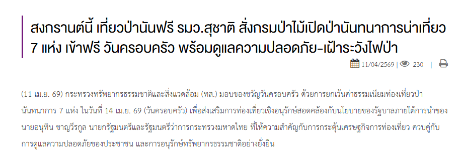 ข่าวตัดจากหนังสือพิมพ์และเว็บไซต์ออนไลน์ที่เกี่ยวข้องของสำนักจัดการป่านันทนาการ (ข่าวประจำวันที่ 11-16 เมษายน 2569)
