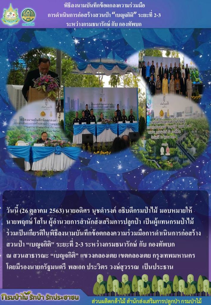 พิธีลงนามบันทึกข้อตกลงความร่วมมือการดำเนินการก่อสร้างสวนป่า”เบญจกิติ”ระยะที่ 2-3รายการนี้ถูกเผยแพร่ใน แผนที่ on 27 ตุลาคม 2020 by nuttapong