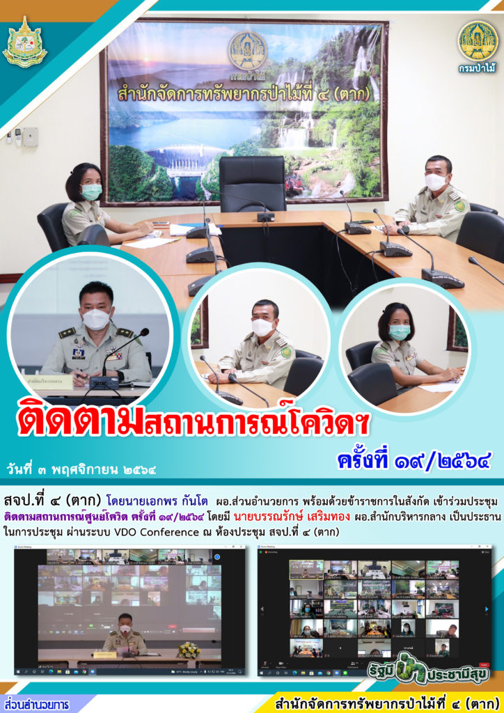 วันพุธที่ 3 พฤศจิกายน 2564 สจป.ที่ 4 (ตาก) โดยนายเอกพร กันโต ผอ.ส่วนอำนวยการ พร้อมด้วยข้าราชการในสังกัด เข้าร่วมประชุมติดตามสถานการณ์ศูนย์โควิด ครั้งที่ 19/2564 โดยมีนายบรรณรักษ์ เสริมทอง ผอ.สำนักบริหารกลาง เป็นประธานในการประชุม ผ่านระบบ VDO Conference ณ ห้องประชุม สจป.ที่ 4 (ตาก)