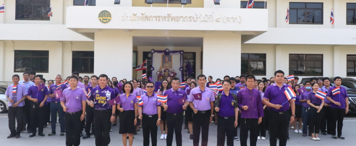 สำนักจัดการทรัพยากรป่าไม้ที่ ๔ (ตาก) นำโดย นายประสิทธิ์ ท่าช้าง ผอ.สจป.ที่ ๔ (ตาก) พร้อมด้วย ผอ.ทุกส่วน/ศูนย์ นำข้าราชการ พนักงานและเจ้าหน้าที่ในสังกัด สวมใส่เสื้อสีม่วง เข้าร่วมพิธีถวายพระพรชัยมงคล และน้อมสำนึกในพระมหากรุณาธิคุณ “กรมสมเด็จพระเทพรัตนราชสุดาฯ” ที่ได้ทรงปฏิบัติพระกรณียกิจด้วยความวิริยะอุตสาหะ ทรงมีพระราชปณิธานในการสืบสานและต่อยอดกิจการที่จะขจัดทุกข์บำรุงสุขแก่ปวงประชาราษฎร์ตามรอยพระราชบิดา ในอันที่จะก่อให้เกิดประโยชน์แก่สังคมและประเทศไทยสืบไป โดยเฉพาะในด้านการอนุรักษ์ทรัพยากรธรรมชาติและสิ่งแวดล้อม พร้อมร่วมกันเปล่งเสียง “ทรงพระเจริญ”เพื่อแสดงความจงรักภักดี ณ บริเวณหน้าอาคาร สจป.ที่ ๔ (ตาก)