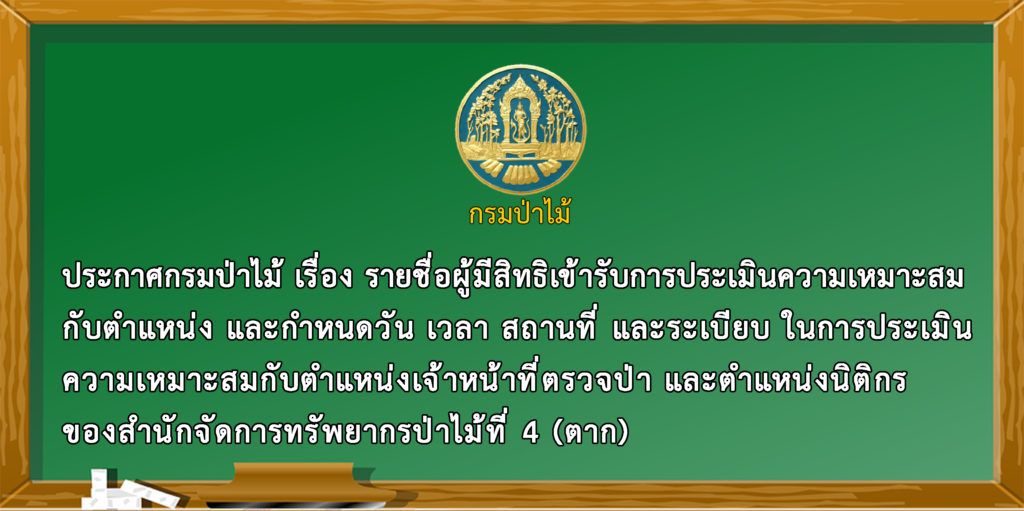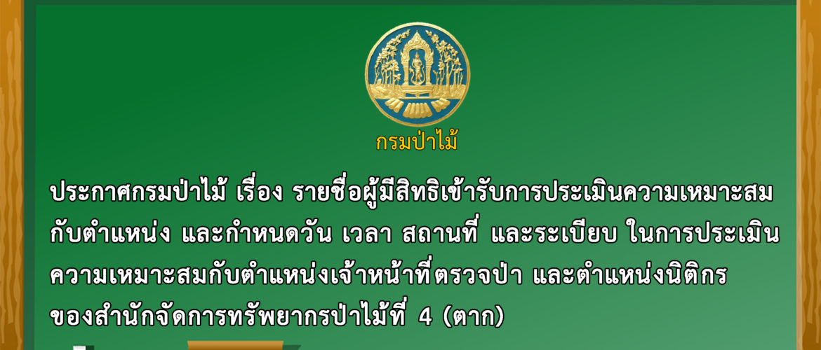 หน้าแรก » รวมภาพกิจกรรม » ประกาศกรมป่าไม้ เรื่อง รายชื่อผู้มีสิทธิเข้ารับการประเมินความเหมาะสมกับตำแหน่ง และกำหนดวัน เวลา สถานที่ และระเบียบ ในการประเมินความเหมาะสมกับตำแหน่งเจ้าหน้าที่ตรวจป่า และตำแหน่งนิติกร ของสำนักจัดการทรัพยากรป่าไม้ที่ 4 (ตาก)
