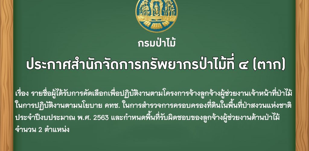 ประกาศสำนักจัดการทรัพยากรป่าไม้ที่ 4 (ตาก) เรื่อง รายชื่อผู้ได้รับการคัดเลือกเพื่อปฏิบัติงานตามโครงการจ้างลูกจ้างผู้ช่วยงานเจ้าหน้าที่ป่าไม้ในการปฏิบัติงานตามนโยบาย คทช. ในการสำรวจการครอบครองที่ดินในพื้นที่ป่าสงวนแห่งชาติ ประจำปีงบประมาณ พ.ศ. 2563 และกำหนดพื้นที่รับผิดชอบของลูกจ้างผู้ช่วยงานด้านป่าไม้ จำนวน 2 ตำแหน่ง