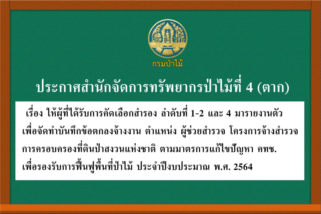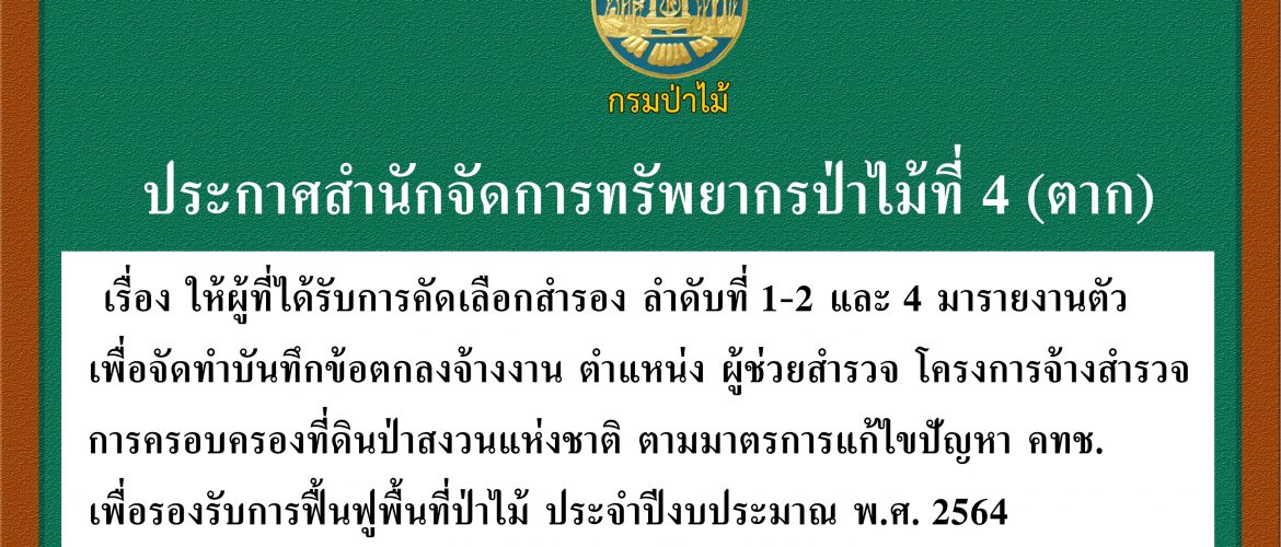 ประกาศสำนักจัดการทรัพยากรป่าไม้ที่ 4 (ตาก)30 กันยายน 2020 ใน รวมภาพกิจกรรม by bunjert ประกาศสำนักจัดการทรัพยากรป่าไม้ที่ 4 (ตาก) เรื่อง ให้ผู้ที่ได้รับการคัดเลือกสำรอง ลำดับที่ 1-2 และ 4 มารายงานตัว เพื่อจัดทำบันทึกข้อตกลงจ้างงาน ตำแหน่ง ผู้ช่วยสำรวจ โครงการจ้างสำรวจการครอบครองที่ดินป่าสงวนแห่งชาติ ตามมาตรการแก้ไขปัญหา คทช. เพื่อรองรับการฟื้นฟูพื้นที่ป่าไม้ ประจำปีงบประมาณ พ.ศ. 2564