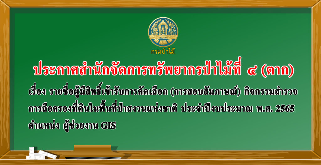 ประกาศสำนักจัดการทรัพยากรป่าไม้ที่ 4 (ตาก) เรื่อง รายชื่อผู้มีสิทธิ์เข้ารับการคัดเลือก (การสอบสัมภาษณ์) กิจกรรมสำรวจการถือครองที่ดินในพื้นที่ป่าสงวนแห่งชาติ ประจำปีงบประมาณ พ.ศ. 2565 ตำแหน่ง ผู้ช่วยงาน GIS