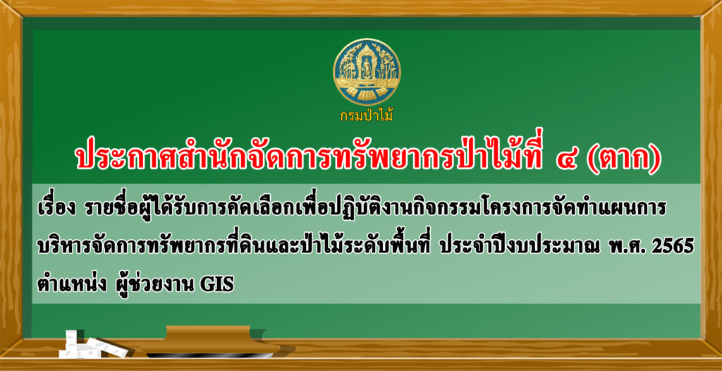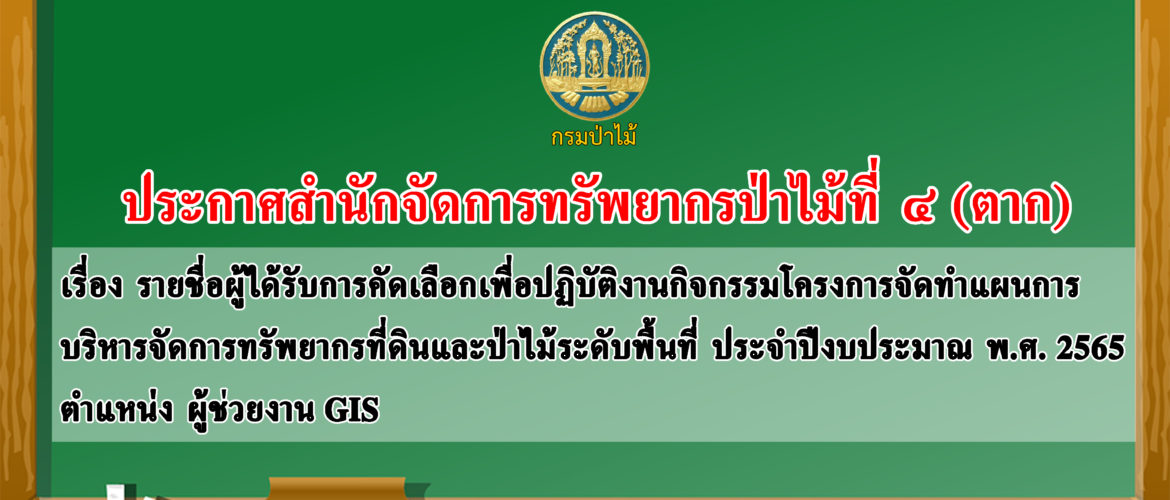 หน้าแรก » รวมภาพกิจกรรม » ประกาศสำนักจัดการทรัพยากรป่าไม้ที่ 4 (ตาก)เรื่อง รายชื่อผู้ได้รับการคัดเลือกเพื่อปฏิบัติงานกิจกรรมโครงการจัดทำแผนการบริหารจัดการทรัพยากรที่ดินและป่าไม้ระดับพื้นที่ ประจำปีงบประมาณ พ.ศ. 2565 ตำแหน่ง ผู้ช่วยงาน GIS