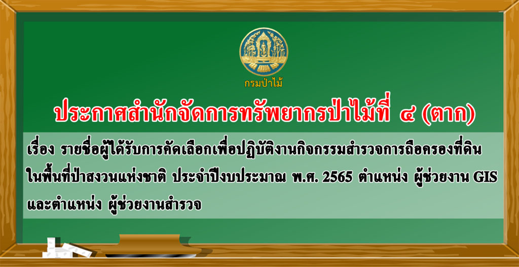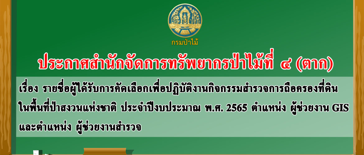 หน้าแรก » รวมภาพกิจกรรม » ประกาศสำนักจัดการทรัพยากรป่าไม้ที่ 4 (ตาก) เรื่อง รายชื่อผู้ได้รับการคัดเลือกเพื่อปฏิบัติงานกิจกรรมสำรวจการถือครองที่ดินในพื้นที่ป่าสงวนแห่งชาติ ประจำปีงบประมาณ พ.ศ. 2565 ตำแหน่ง ผู้ช่วยงาน GIS และตำแหน่ง ผู้ช่วยงานสำรวจ
