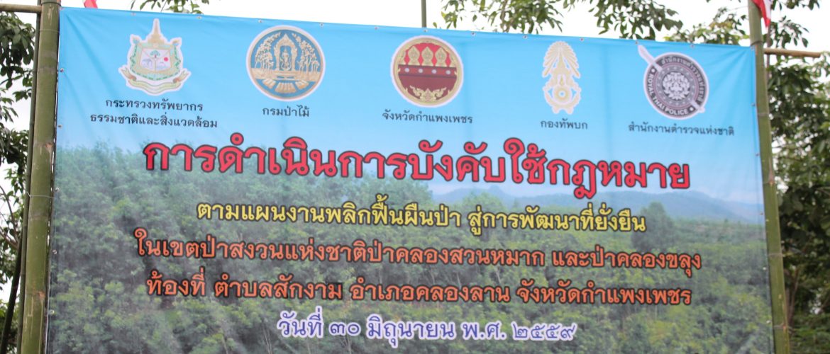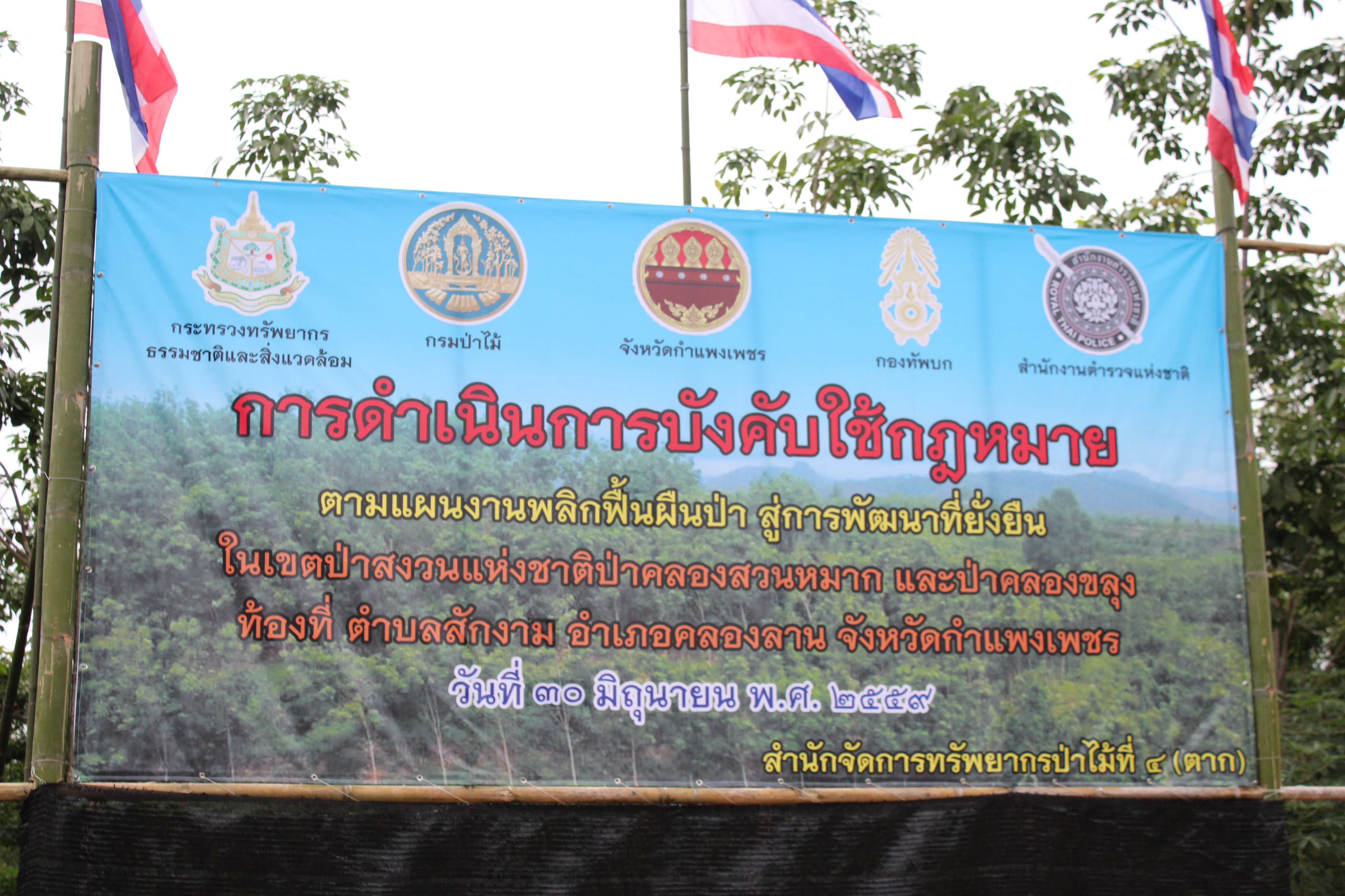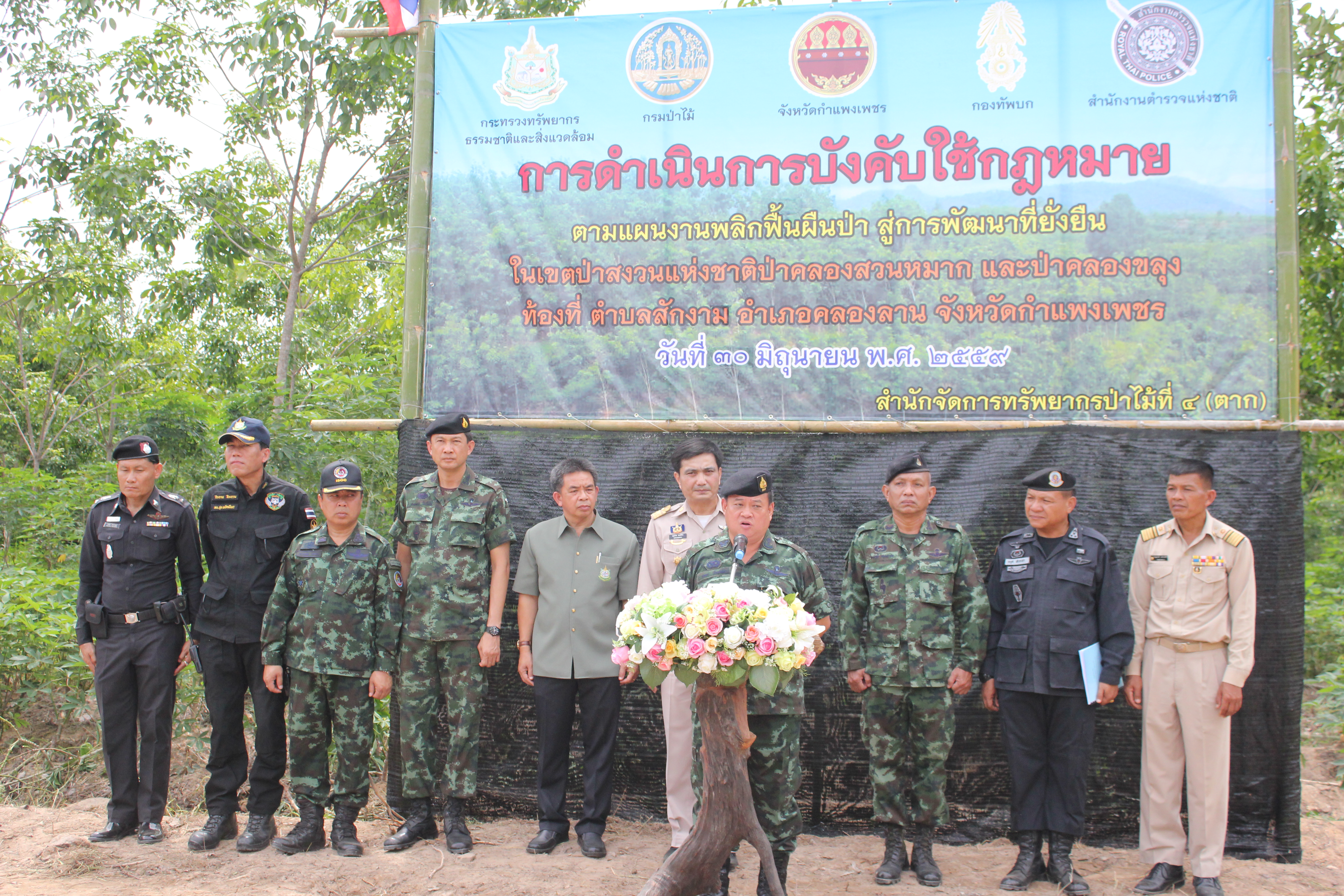 เมื่อวันที่ 30 มิถุนายน 2559 สำนักจัดการทรัพยากรป่าไม้ที่ 4 (ตาก) ร่วมกับชุดพยัคฆ์ไพร กรมป่าไม้ หน่วยงานทหาร ตำรวจ ฝ่ายปกครองในพื้นที่นิคมสหกรณ์คลองสวนหมาก และหน่วยงานที่เกี่ยวข้อง ได้จัดพิธีปล่อยแถวกำลังพล การดำเนินการบังคับใช้ตามแผนพลิกฟื้นผืนป่า สู่การพัฒนาที่ยั่งยืน ณ บริเวณบ้านสักงาม หมู่ที่ 1 ตำบลสักงาม อำเภอคลองลาน จังหวัดกำแพงเพชร โดยมี พล.ต.นพพร เรือนจันทร์ ผู้บัญชาการกองกำลังนเรศวร เป็นประธานในพิธี และนายสมหวัง เรืองนิวัติศัย ผู้อำนวยการสำนักจัดการทรัพยากรป่าไม้ ที่ 4 (ตาก) เป็นผู้กล่าวรายงาน โดยมีกำลังพลเข้าร่วมทั้งหมด จำนวน 300 นาย โดยจะเข้าดำเนินการตรวจยึดแปลงสวนยางพารา พร้อมด้วยนายนฤพนธ์ ทิพย์มณฑา ผู้อำนวยการส่วนป้องกันรักษาป่า นายประจักษ์ สุวรรณเดช หัวหน้าหน่วยป้องกันรักษาป่าที่ ก.พ.๘ (เพชรนิยม) ซึ่งเป็นหน่วยที่รับผิดชอบในพื้นที่ ร่วมกับเจ้าหน้าที่หน่วยงานต่างๆที่เกี่ยวข้องเข้าตรวจยึดพื้นที่ จำนวน 4 แปลง รวมเนื้อที่ ไม่ต่ำกว่า 2,400 ไร่ ส่ง สภ.คลองลาน ดำเนินคดีเพื่อสืบสวนหาตัวผู้กระทำผิดต่อไป