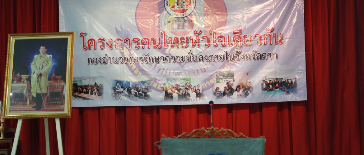 โครงการคนไทยหัวใจเดียวกัน ซึ่งเป็นไปตามนโยบายของรัฐบาลและคณะรักษาความสงบแห่งชาติ ที่จะให้มีการสร้างความรัก ความสามัคคี ปรองดองสมานฉันท์ในสังคม รวมทั้งรับฟังข้อคิดเห็นจากประชาชนในการปฏิรูปประเทศ16 พฤษภาคม 2017 ใน รวมภาพกิจกรรม by bunjert เมื่อวันที่ 16 พฤษภาคม 2560 เวลา 10.00-12.00 น. กองอำนวยการรักษาความมั่นคงภายในจังหวัดตาก ได้จัดทำโครงการคนไทยหัวใจเดียวกัน ซึ่งเป็นไปตามนโยบายของรัฐบาลและคณะรักษาความสงบแห่งชาติ ที่จะให้มีการสร้างความรัก ความสามัคคี ปรองดองสมานฉันท์ในสังคม รวมทั้งรับฟังข้อคิดเห็นจากประชาชนในการปฏิรูปประเทศ โดยมีนายยุทธชัย ปัทมสนธิ ผู้อำนวยการสำนักบริหารพื้นที่อนุรักษ์ที่ 14 (ตาก) นายนฤพนธ์ ทิพย์มณฑา ผู้อำนวยการส่วนป้องกันรักษาป่าและควบคุมไฟป่า รักษาราชการแทนผู้อำนวยการสำนักจัดการทรัพยากรป่าไม้ที่ 4 (ตาก) พร้อมด้วยข้าราชการ พนักงาน เจ้าหน้าที่สำนักจัดการทรัพยากรป่าไม้ที่ 4 (ตาก) หน่วยป้องกันรักษาป่าฯ และสำนักบริหารพื้นที่อนุรักษ์ ที่ 14 (ตาก) เข้าร่วมสัมมนา รวมจำนวน 100 คน โดยมีพันเอกเสมา มังมติ รองผู้อำนวยการรักษาความมั่นคงภายในจังหวัดตากปฎิบัติราชการแทนผู้อำนวยการรักษาความมั่นคงภายในจังหวัดตาก เป็นประธานในการอบรมสัมมนา ณ ห้องประชุมอเนกประสงค์ (ศาลาร่วมใจ)