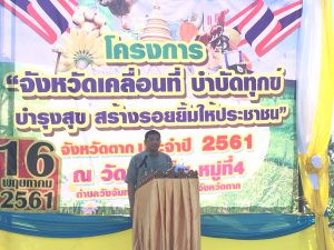 เมื่อวันที่ 16 พฤษภาคม 2561 เวลา 08.30 น. สำนักจัดการทรัพยากรป่าไม้ที่ 4 (ตาก) โดยเจ้าหน้าที่ศูนย์บริการประชาชน ส่วนอำนวยการ สถานีเพาะชำกล้าไม้ตาก ส่วนส่งเสริมการปลูกป่าและหน่วยป้องกันรักษาที่ ตก.16 (เด่นไม้ซุง) เข้าร่วมการดำเนินโครงการจังหวัดเคลื่อนที่ บำบัดทุกข์ บำรุงสุข สร้างรอยยิ้มให้ประชาชน จังหวัดตาก ประจำปี 2561 โดยมีนาย เจริญฤทธิ์ สงวนสัตย์ ผู้ว่าราชการจังหวัดตาก เป็นประธานในพิธี ณ วัดนาตาโพ หมู่ที่ 4 ตำบลวังจันทร์ อำเภอสามเงา จังหวัดตาก โดย สจป.ที่ 4 (ตาก) นำกล้าไม้มาแจก จำนวน 500 ต้น