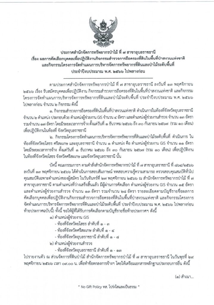 เผยแพร่แล้ว 9 ธันวาคม 2024 ส่วนจัดการที่ดินป่าไม้ สำนักจัดการทรัพยากรป่าไม้ที่ ๗ สาขาอุบลราชธานีรับสมัครบุคคลเพื่อปฏิบัติงาน กิจกรรมจัดที่ดินทำกินให้ชุมชนตามนโยบายรัฐบาลภายใต้คณะกรรมการนโยบายที่ดินแห่งชาติเพื่อแก้ไขปัญหาที่ดินของราษฎรในพื้นที่ป่าประจำปีงบประมาณ พ.ศ. ๒๕๖๘ ตำแหน่ง เจ้าหน้าที่ GIS จำนวน 6 อัตรา